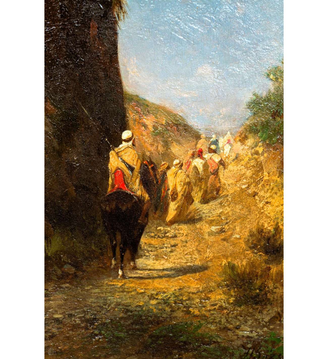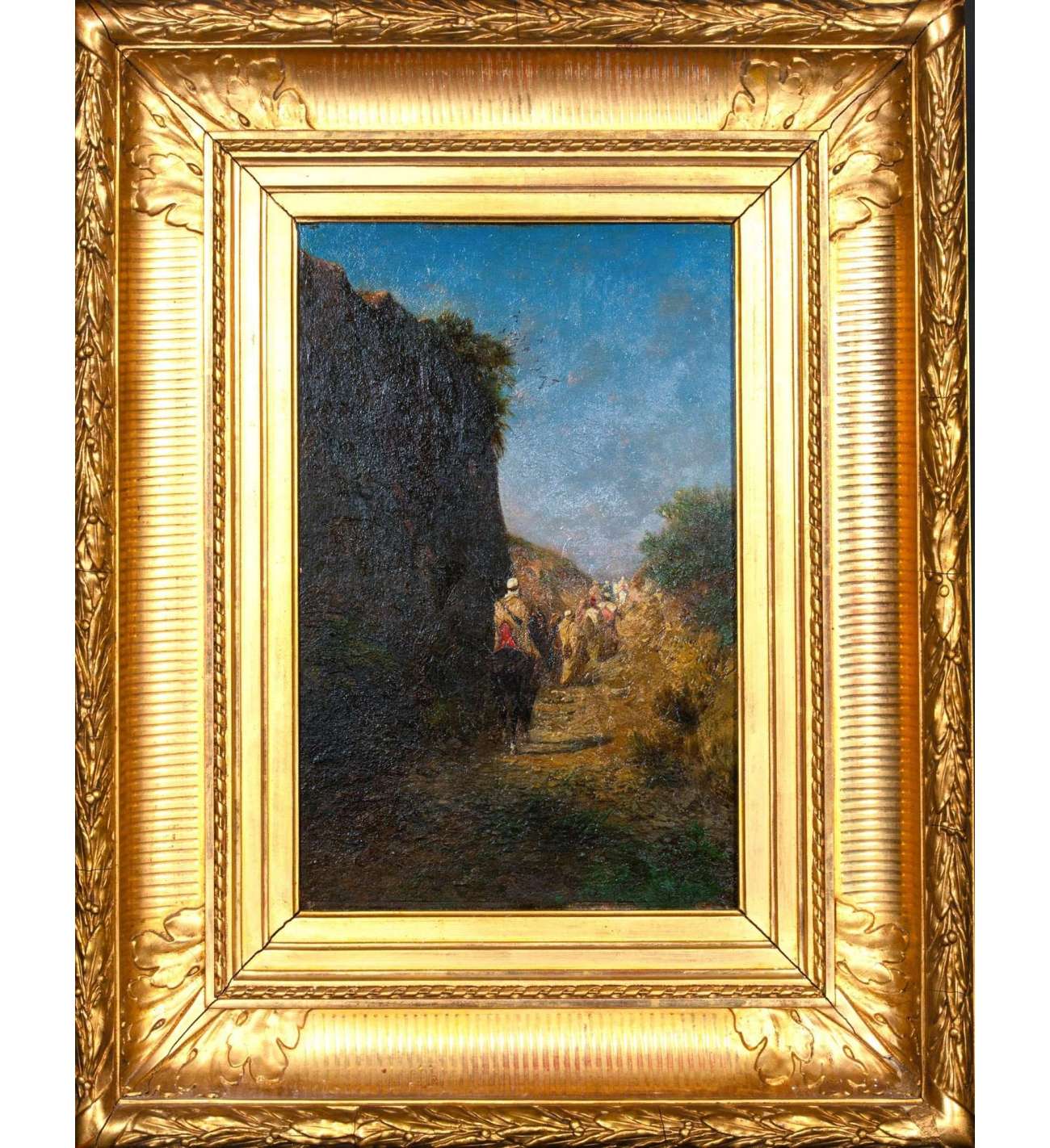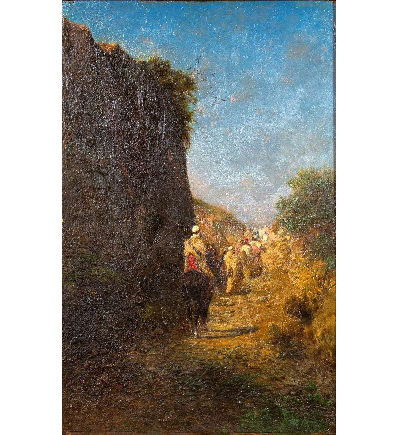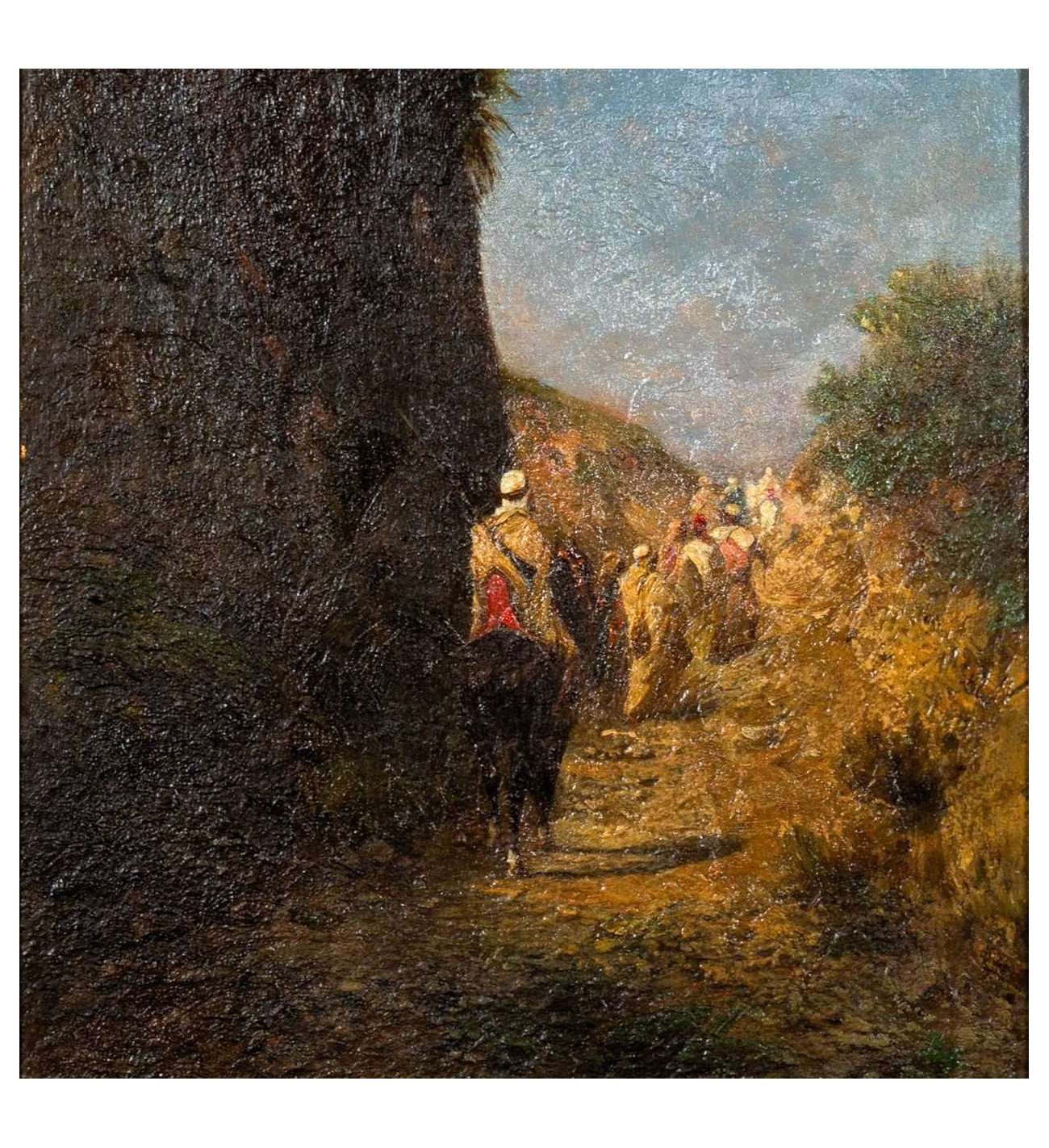 This work is a rigorous composition by the artist Honoré Boze, a notable figure in 19th-century French Orientalism. The scene depicts a caravan of riders and Bedouins progressing along a steep path, flanked by a monumental rock face. The artist uses strong chromatic contrast to emphasize the vastness of the desert landscape against the human presence, capturing the very essence of North African travels during the 19th century.