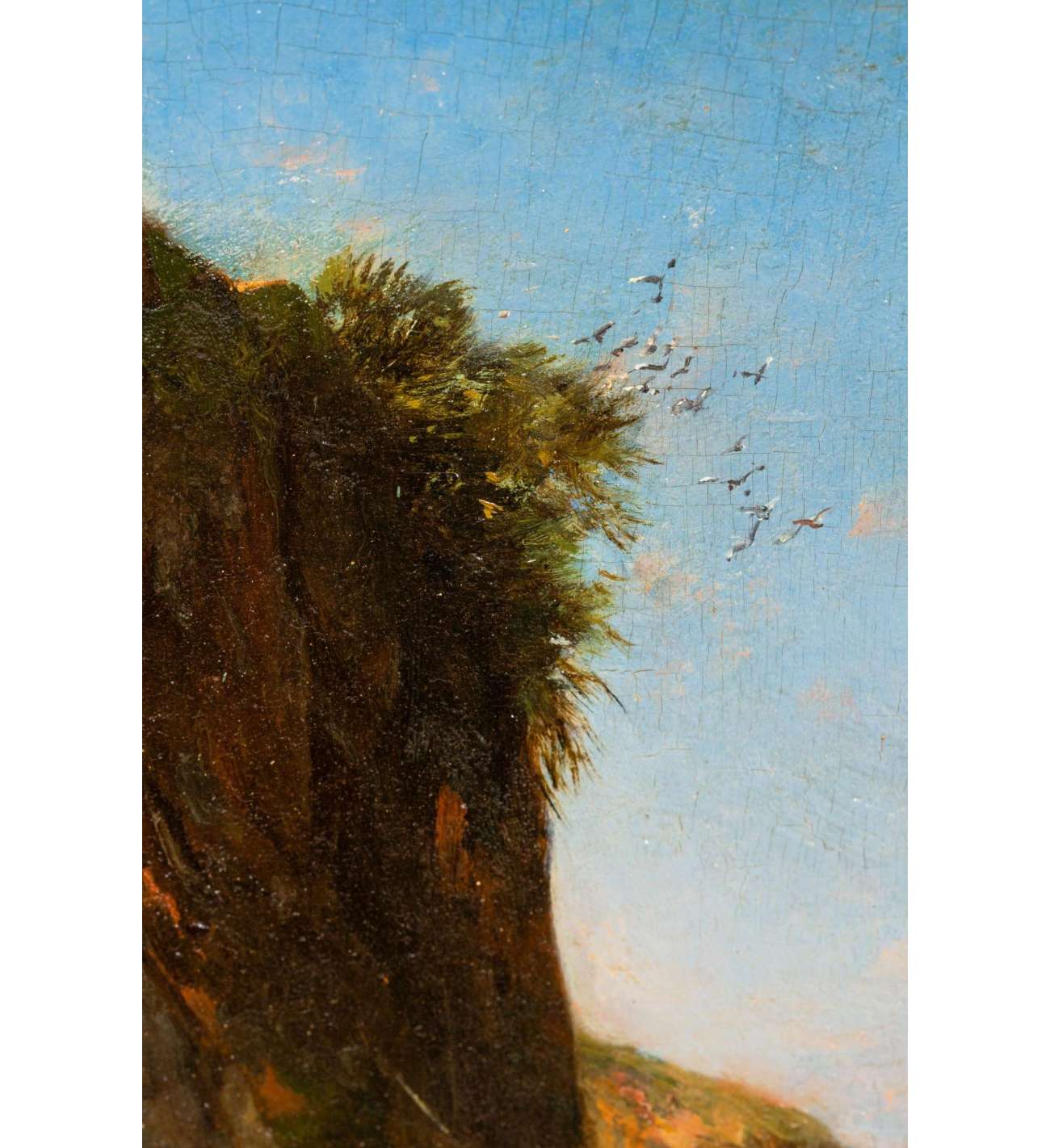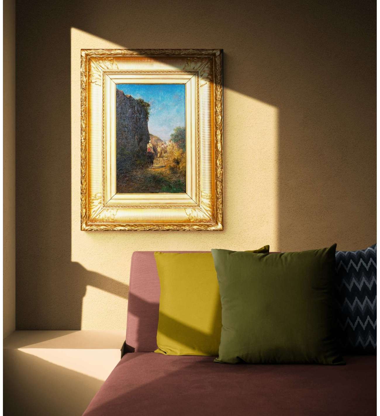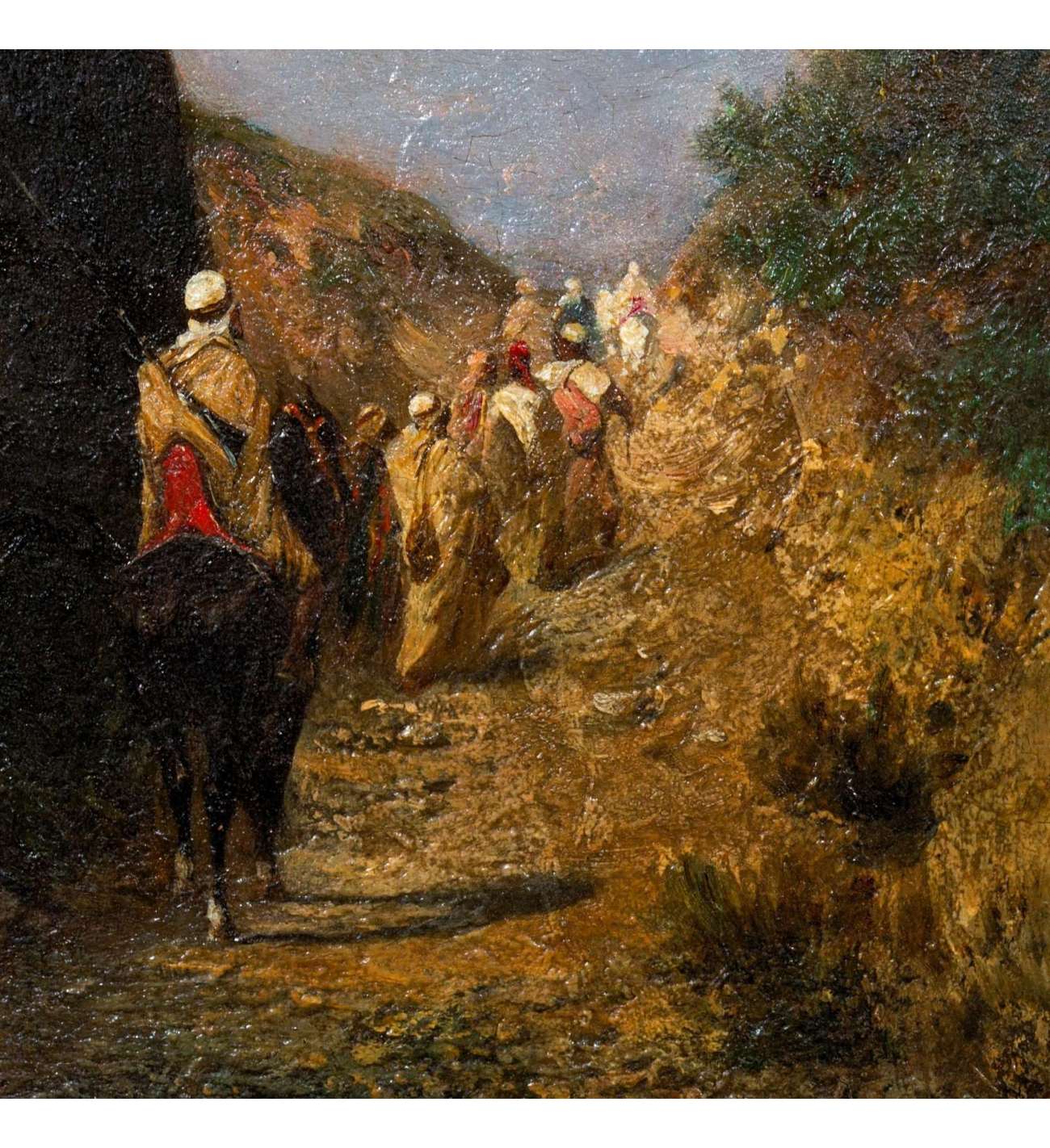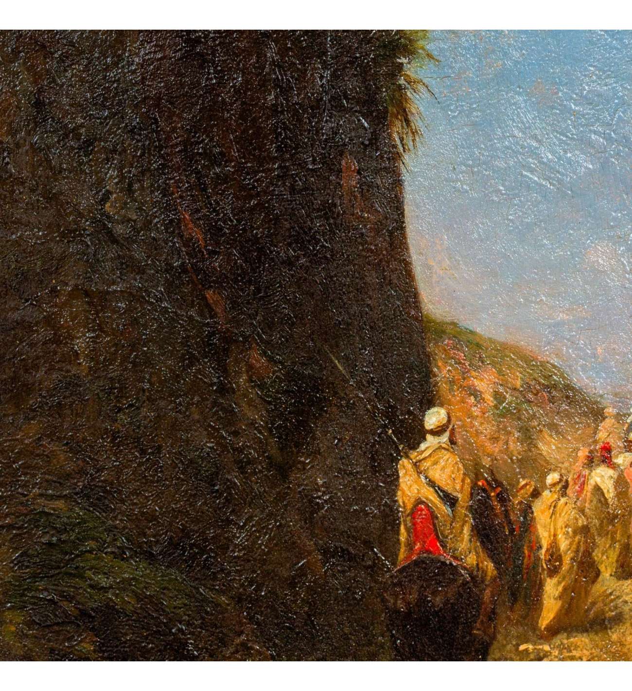 This work is a rigorous composition by the artist Honoré Boze, a notable figure in 19th-century French Orientalism. The scene depicts a caravan of riders and Bedouins progressing along a steep path, flanked by a monumental rock face. The artist uses strong chromatic contrast to emphasize the vastness of the desert landscape against the human presence, capturing the very essence of North African travels during the 19th century.