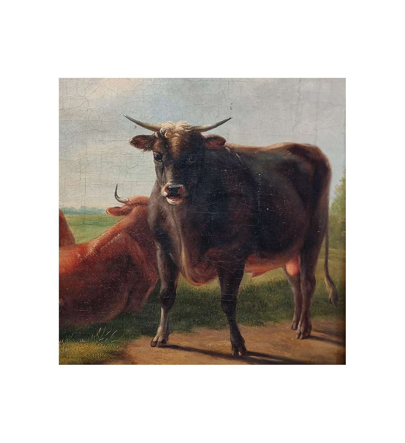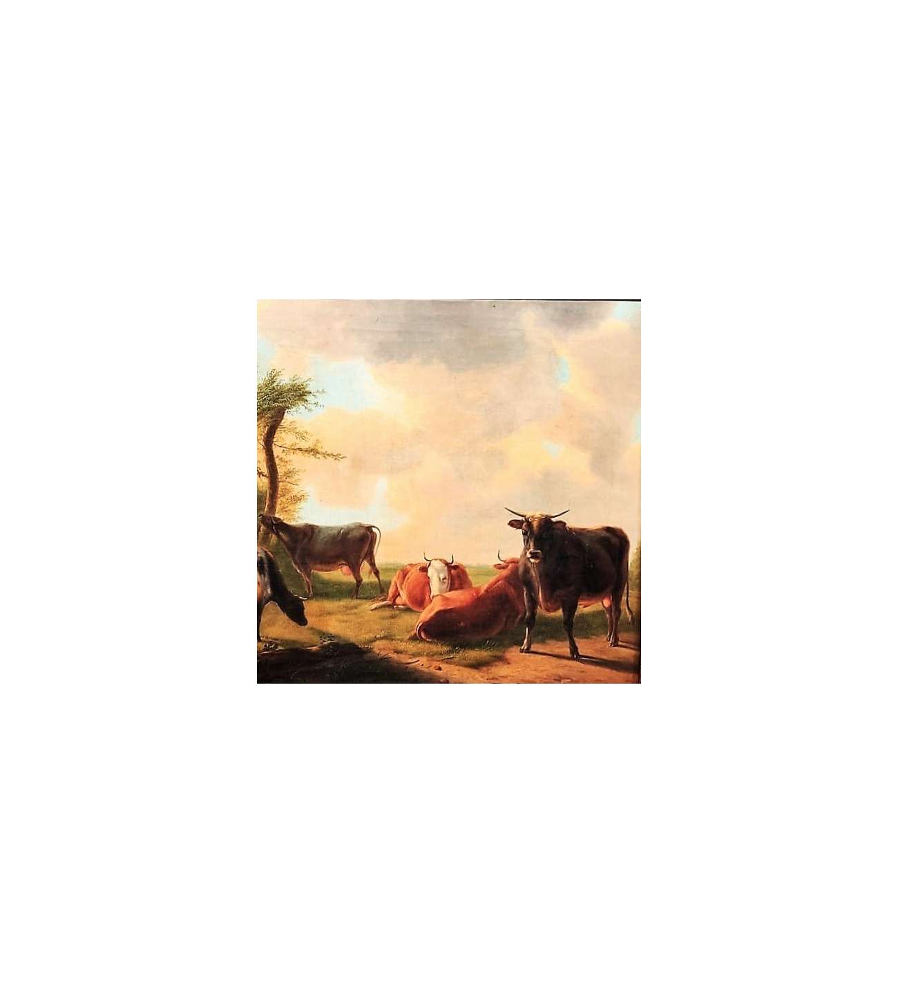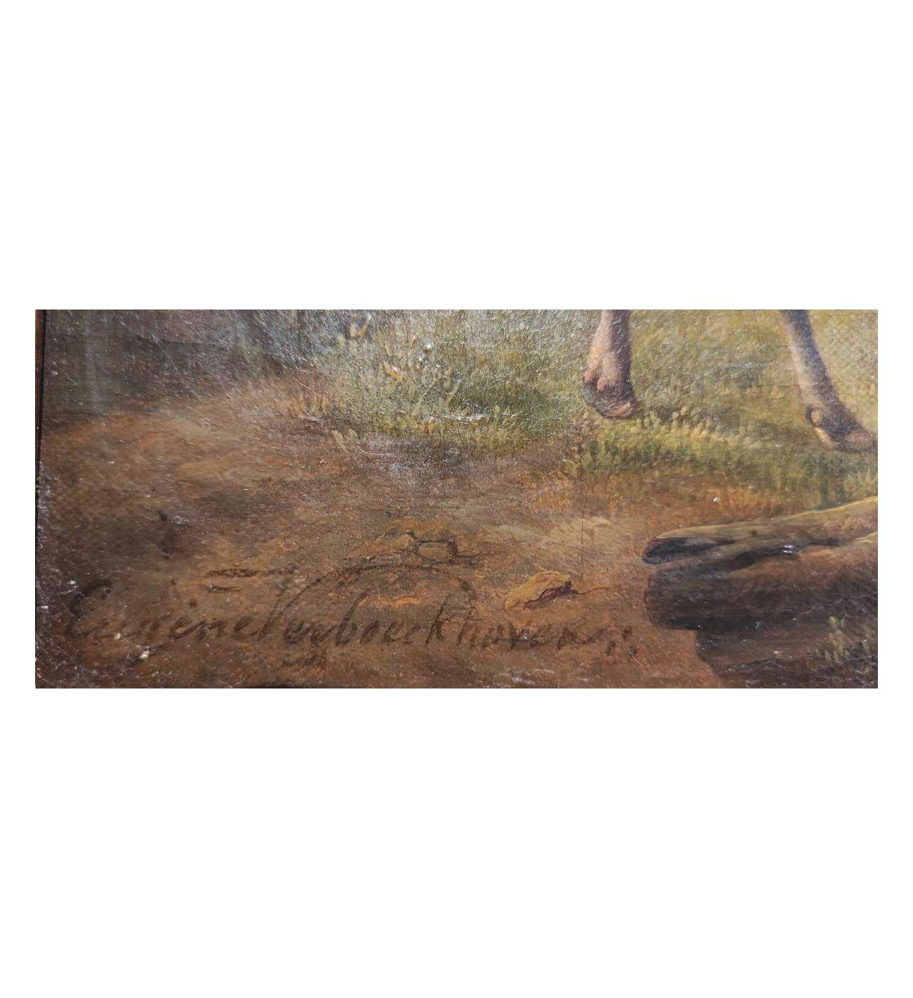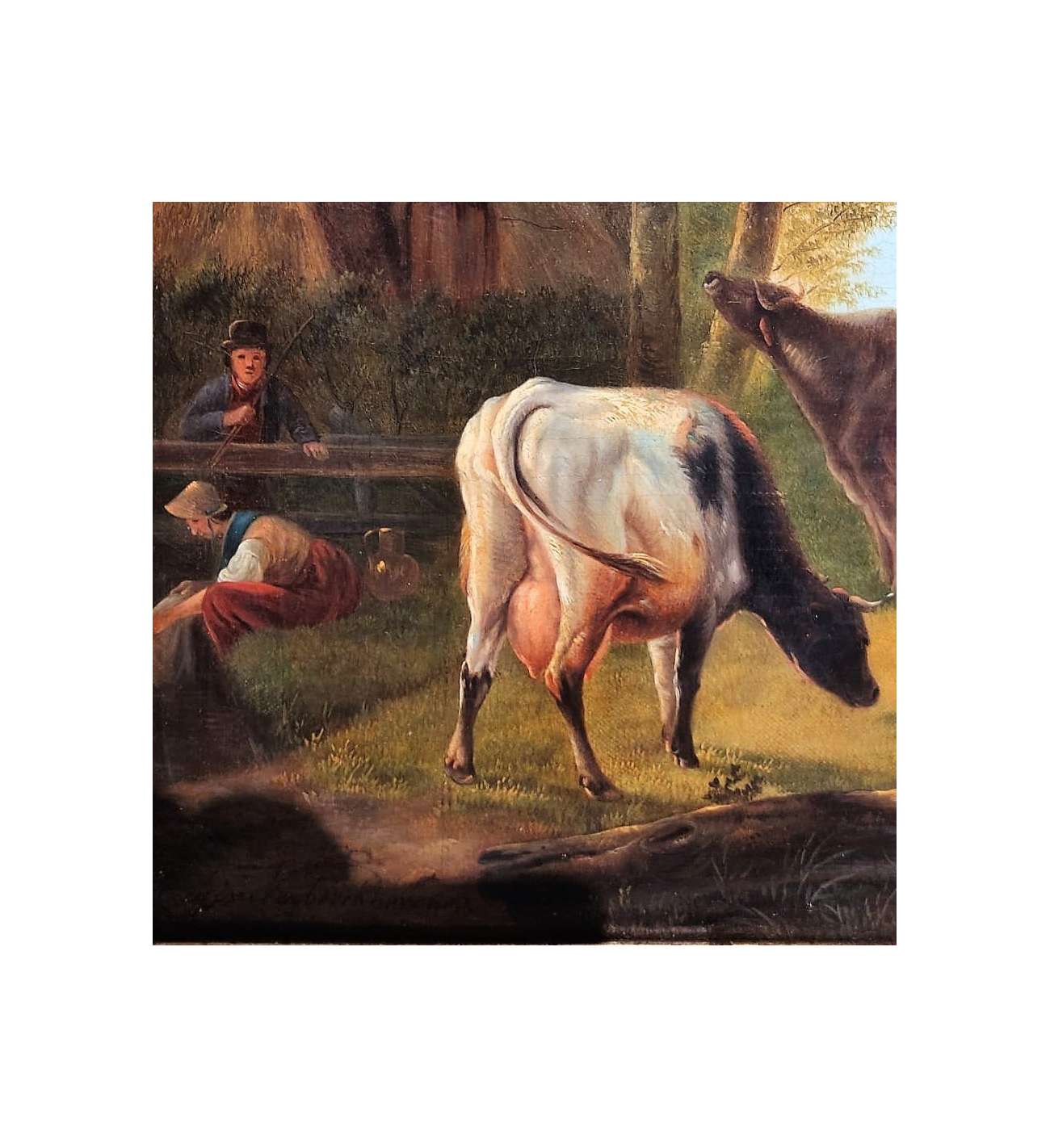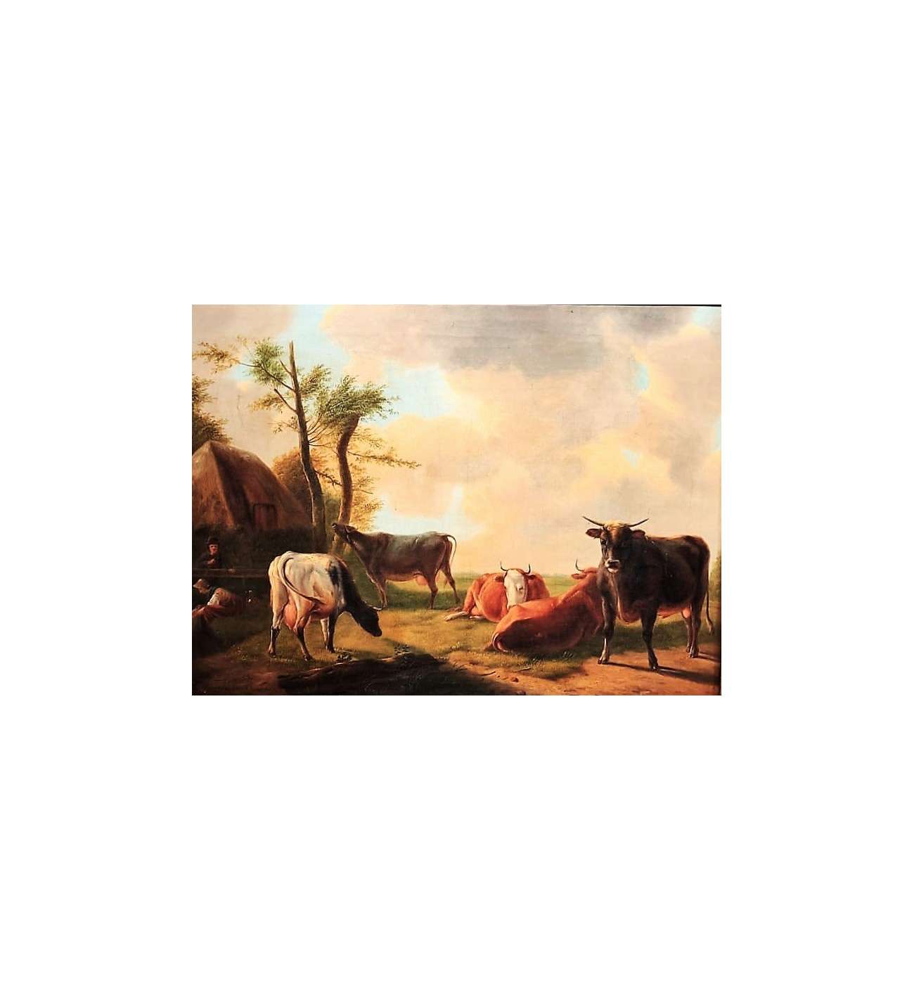 This oil on canvas brilliantly illustrates the excellence of Eugène Verboeckhoven, the undisputed master of 19th-century animal painting. The scene captures a moment of rural tranquility where a group of cows and a bull occupy the foreground of a Flemish meadow. The artist demonstrates his exceptional talent for rendering textures: the grain of the skin, the softness of the fur, and the moisture of the muzzles are treated with striking realism. The lateral light sculpts the volumes and lends an almost living presence to the animals, while the background, featuring a cottage and a hazy sky, creates a serene atmosphere.