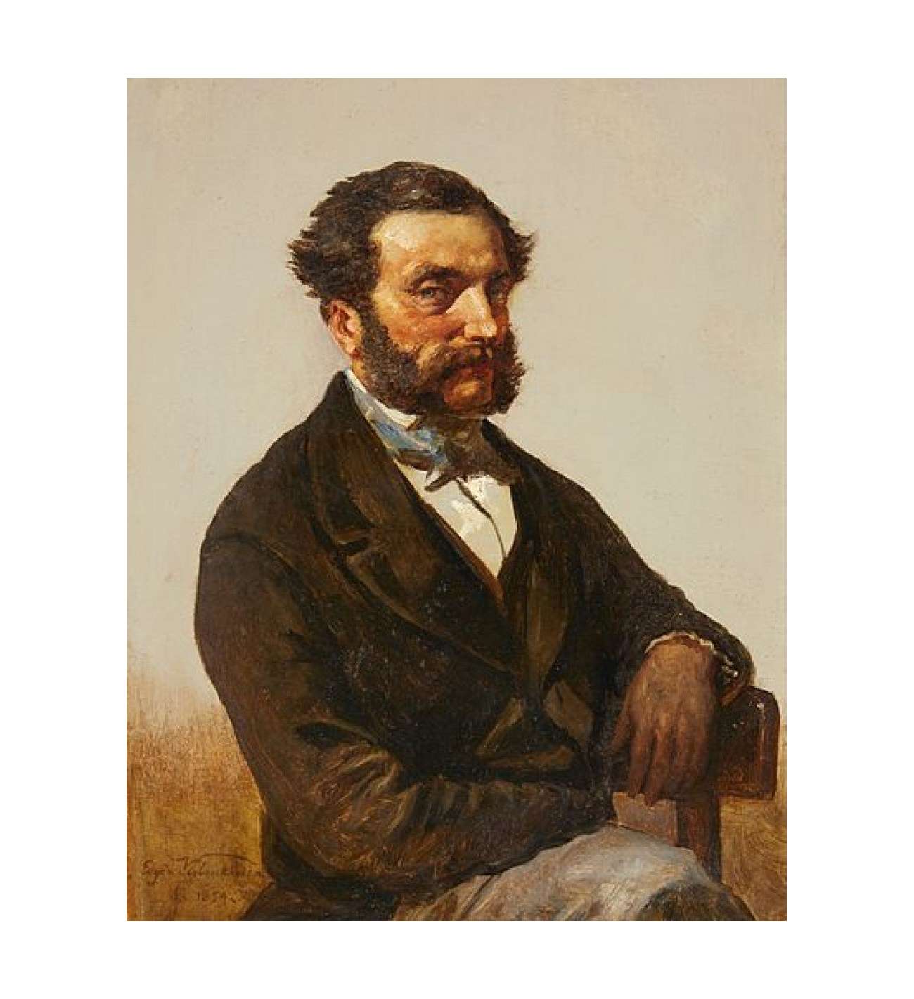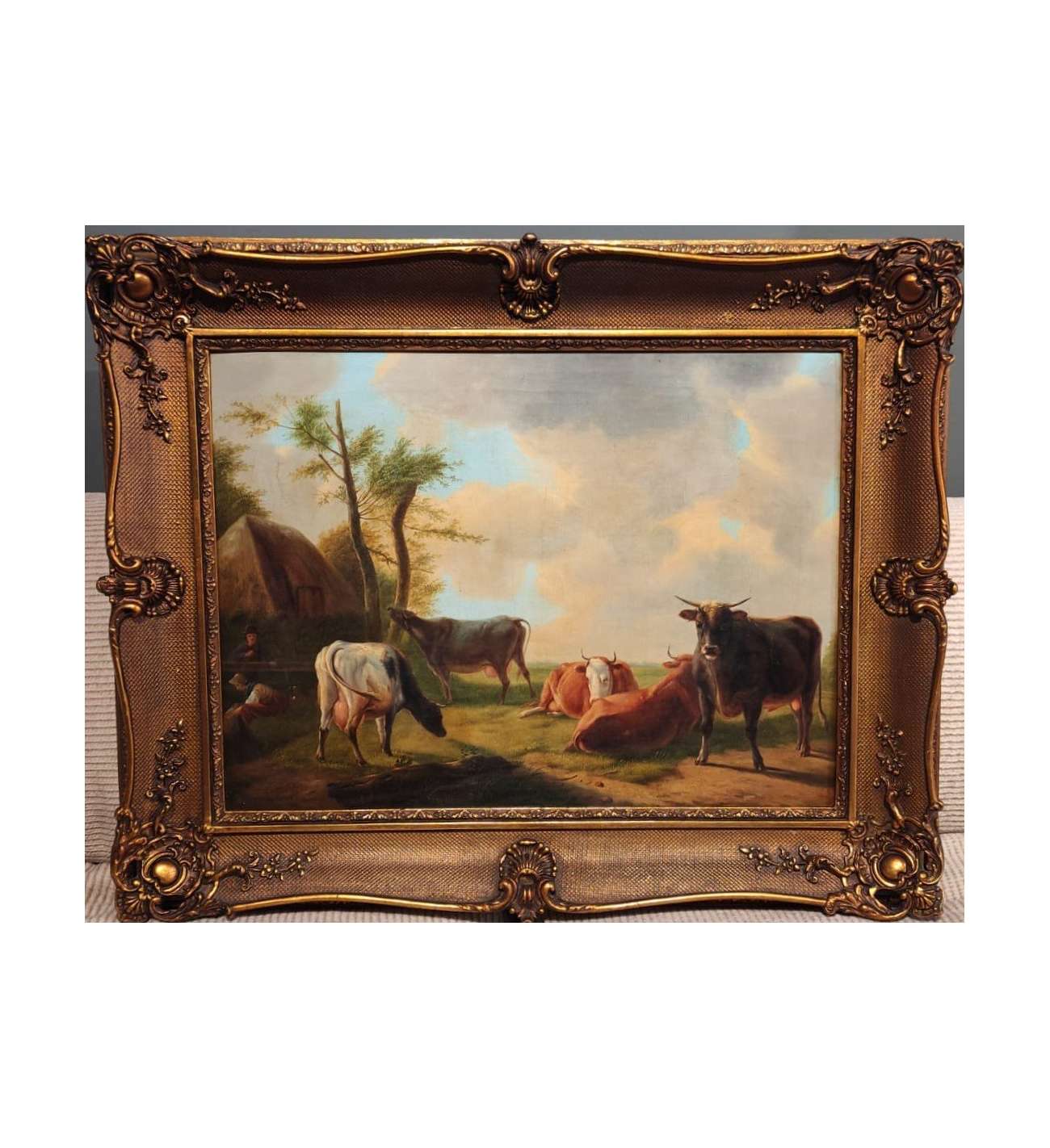 Verboeckhoven does more than just represent nature; he idealizes it through rigorous composition and a palette of subtle, earthy tones. The bull, powerful and calm, anchors the work with its stature, contrasting with the gentleness of the resting cows. This work bears witness to the golden age of the Belgian school and the 19th-century elite's fascination with these bucolic scenes. Presented in a richly decorated gilded wood frame, this painting is a significant piece for any collector of classical art and European genre painting.