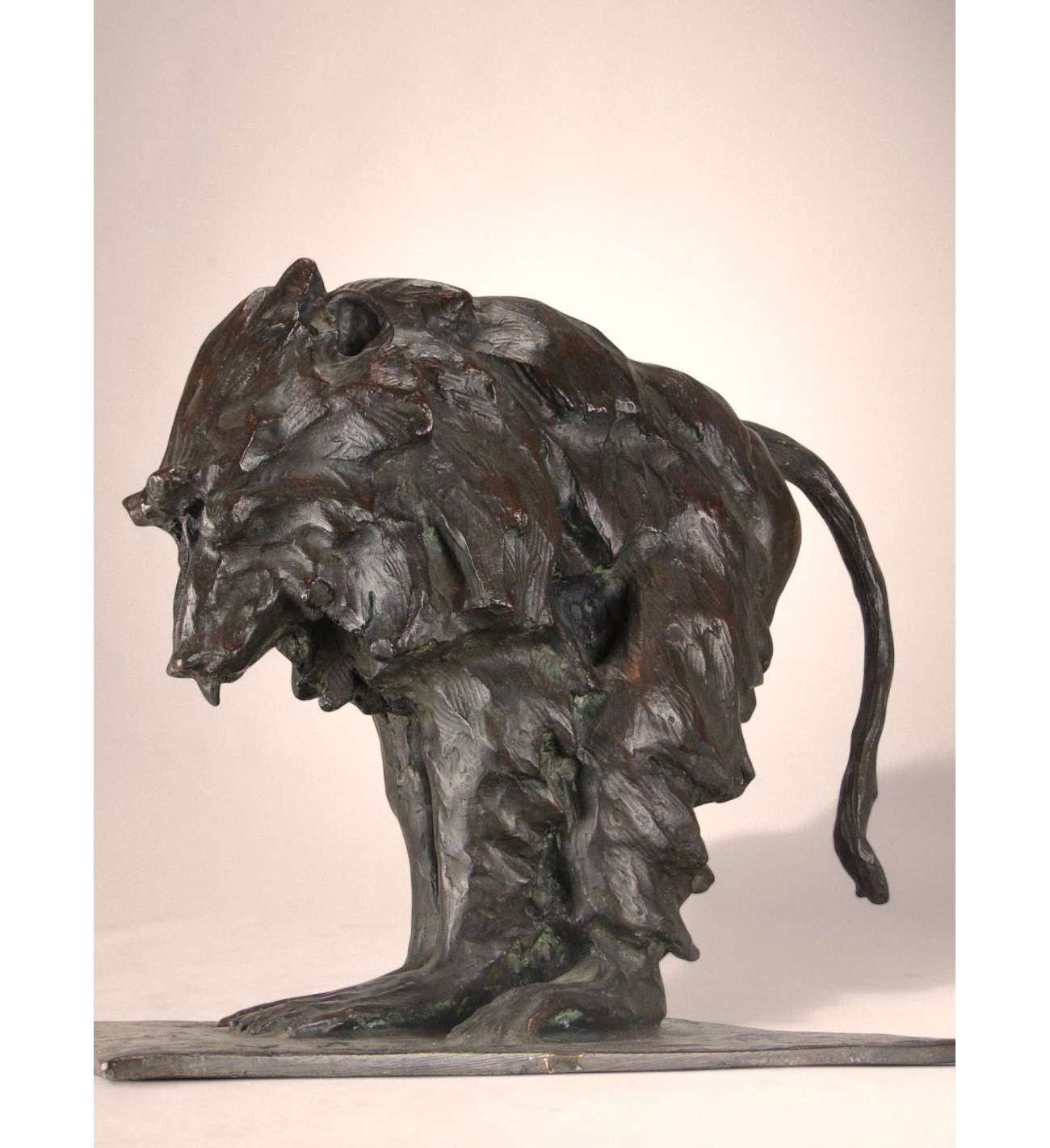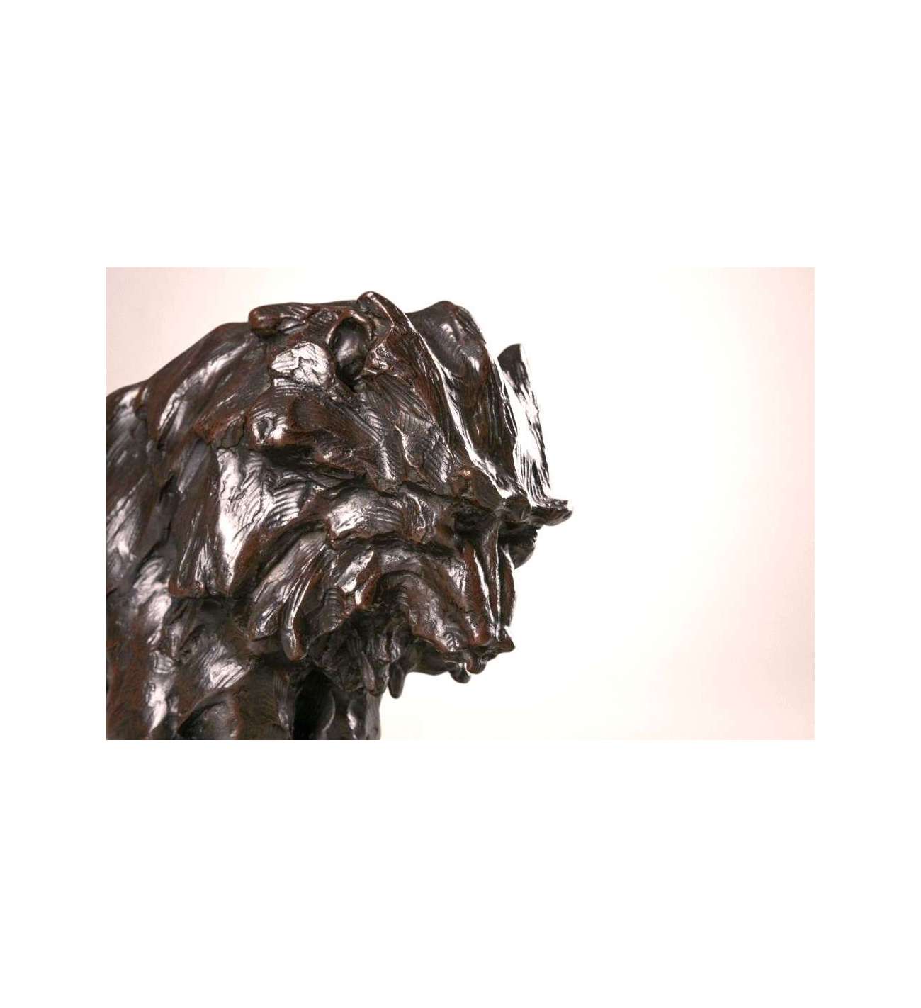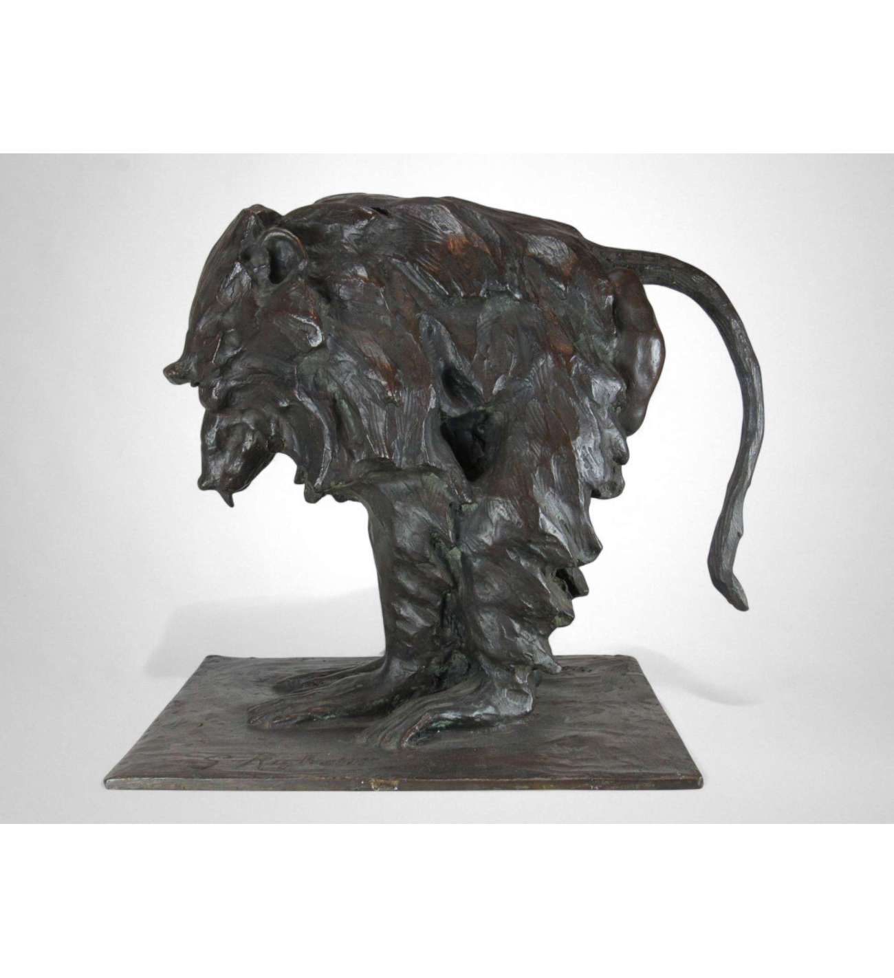 Righetti's modelling is vigorous and deeply expressive. The surface is animated by sweeping tool marks and textured planes that capture the thick folds of the animal’s fur and the almost architectural structure of its body. The bronze has a dark brown patina enriched by warmer highlights and greenish undertones, subtly enhancing the dynamic modelling and lending depth and presence to the work.