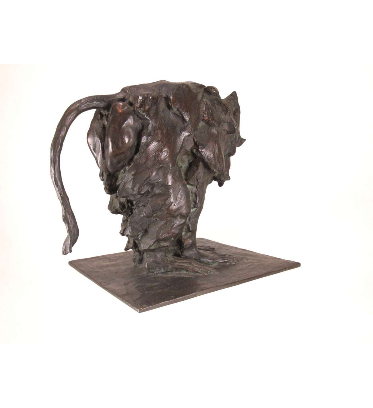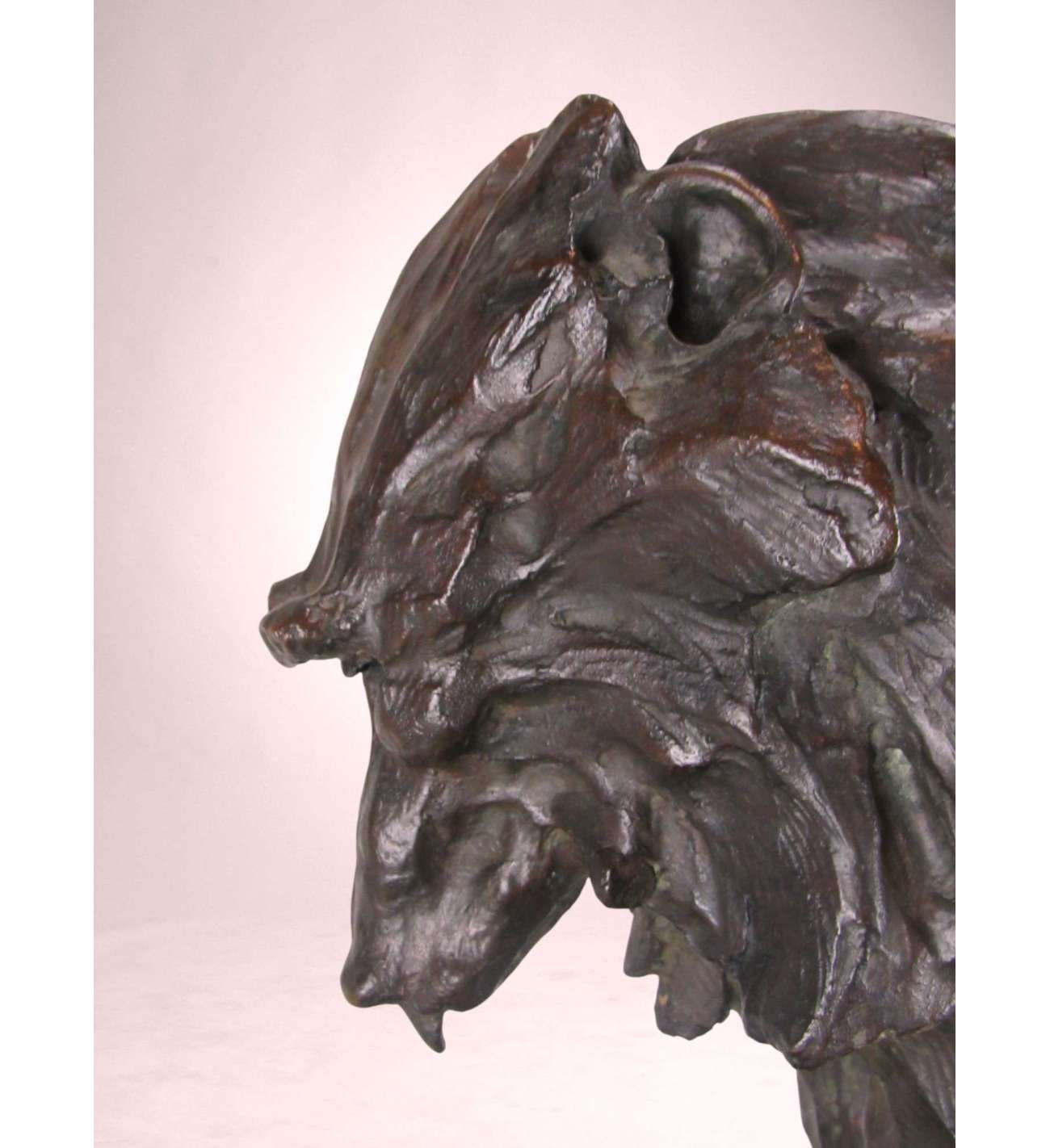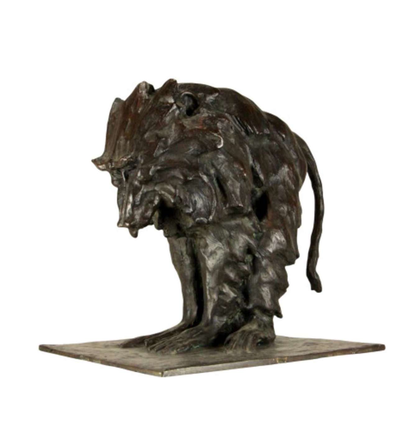 Righetti's modelling is vigorous and deeply expressive. The surface is animated by sweeping tool marks and textured planes that capture the thick folds of the animal’s fur and the almost architectural structure of its body. The bronze has a dark brown patina enriched by warmer highlights and greenish undertones, subtly enhancing the dynamic modelling and lending depth and presence to the work.