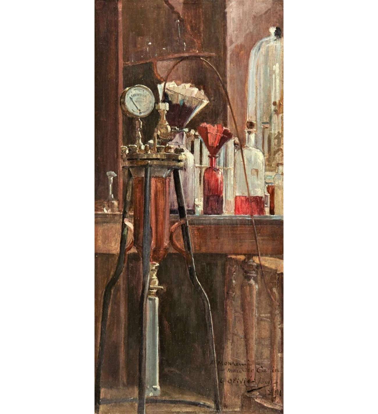 Olivié Léon, "The Laboratory" (1891): A plunge into the scientific world of the 19th century. This oil on panel, signed and dated by the artist, offers an intimate glimpse into a laboratory of the period. The meticulous detail and subtle color palette make this a spellbinding work. Dedicated to Maurice Cazin, the famous surgeon, this painting bears witness to the links between art and science.