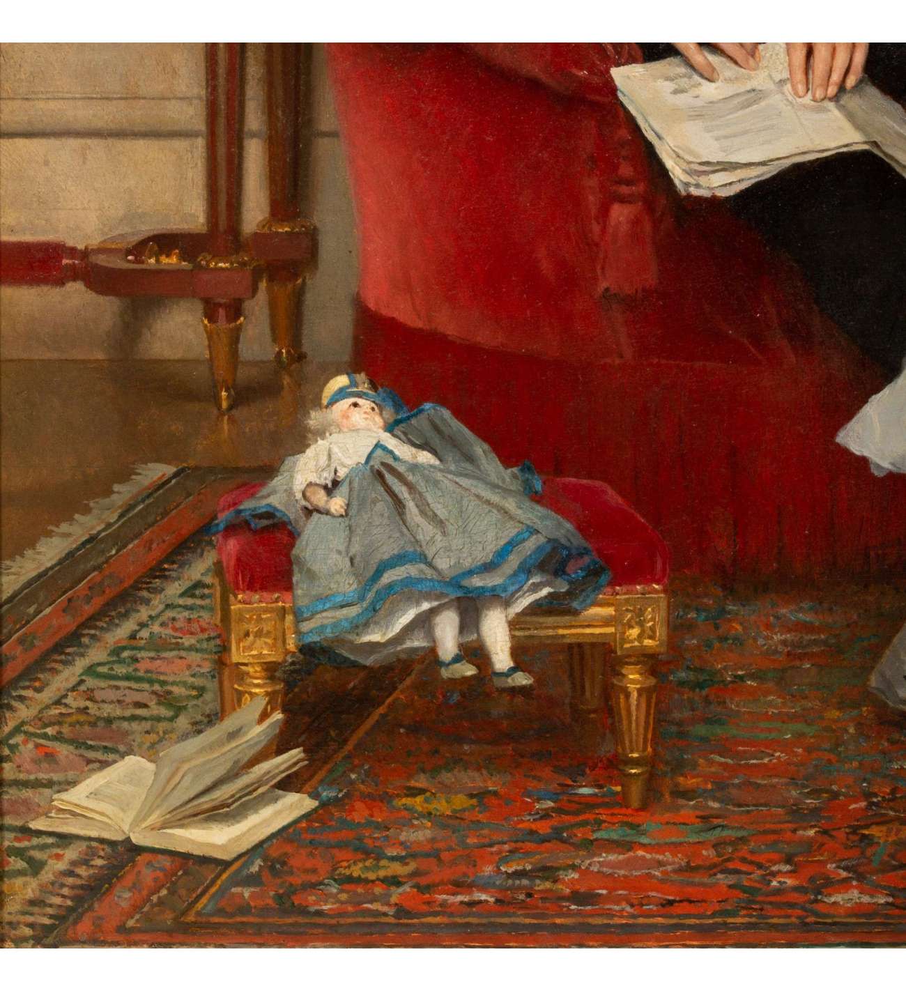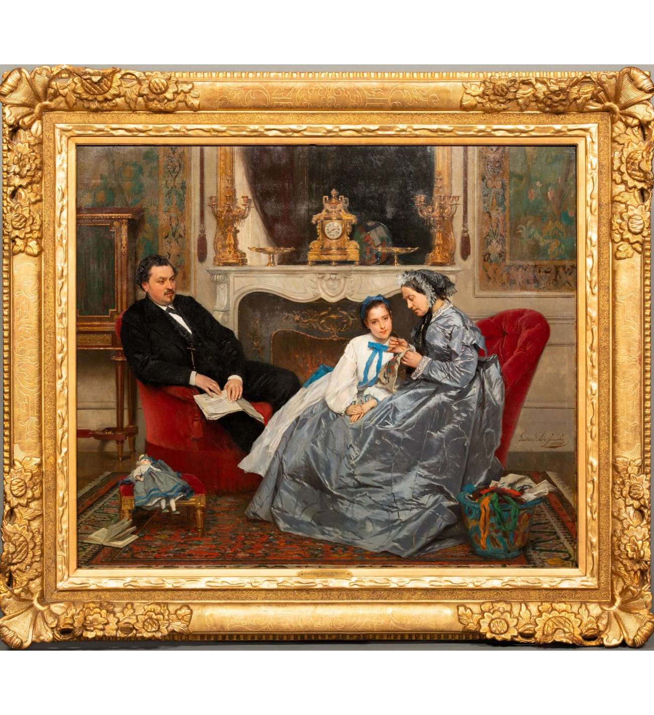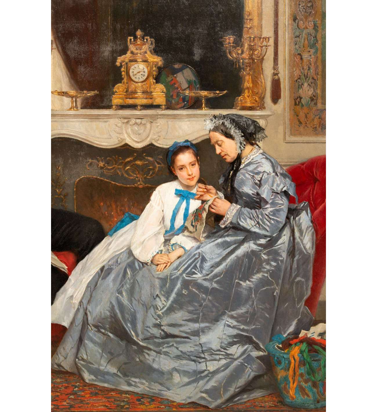 "La leçon de broderie" de Gustave De Jonghe est une scène d'intérieur domestique, intime et soigneusement composée. Le tableau représente trois personnages : un homme, une jeune fille et une femme âgée, qui est la grand-mère de la jeune fille. La grand-mère et la jeune fille sont assises l'une à côté de l'autre sur un canapé richement rembourré, suivant une leçon de broderie. La posture attentive de la grand-mère et la concentration de la jeune fille suggèrent un moment d'apprentissage partagé et de connexion entre les générations. Pendant ce temps, l'homme, probablement le père de la jeune fille, est assis dans un fauteuil rouge en peluche sur le côté gauche de la composition, tenant un papier ou un livre. Il observe la leçon d'un air détendu, ce qui renforce l'atmosphère calme et familiale. Au premier plan, une poupée est placée sur une petite chaise et un panier rempli de fils et de tissus colorés est posé à côté de la grand-mère, soulignant l'environnement domestique et nourricier. Ces éléments ajoutent non seulement des détails à la scène, mais soulignent également l'aspect éducatif du rôle de la grand-mère dans la transmission des compétences à la génération suivante. L'arrière-plan présente une cheminée ornée, qui ajoute de la chaleur et de la profondeur à la scène. La cheminée est décorée d'une horloge complexe et de chandeliers, ce qui renforce le caractère luxueux de l'intérieur. La richesse du décor, y compris la moquette à motifs et les revêtements muraux, reflète l'aisance de la famille.
