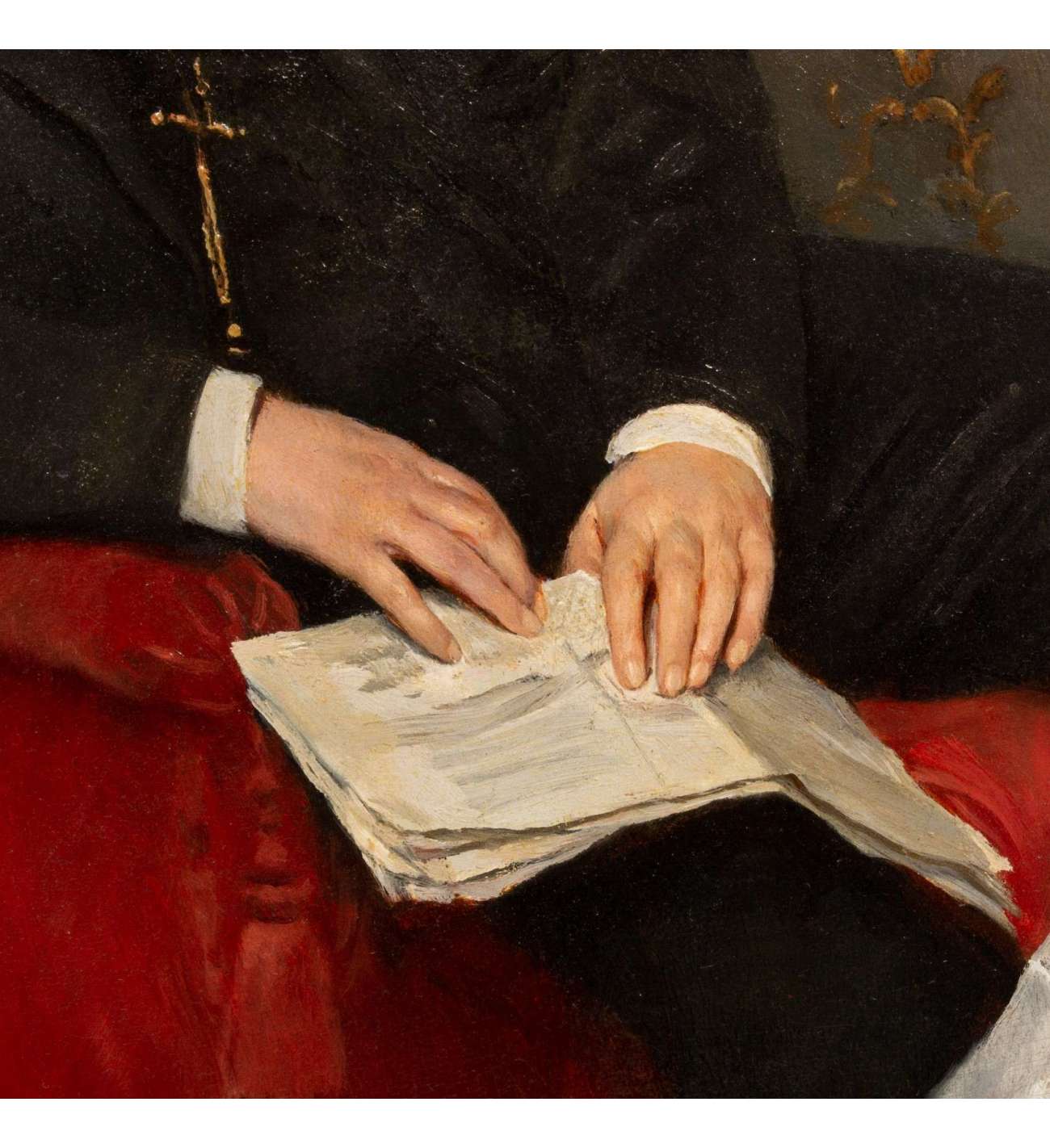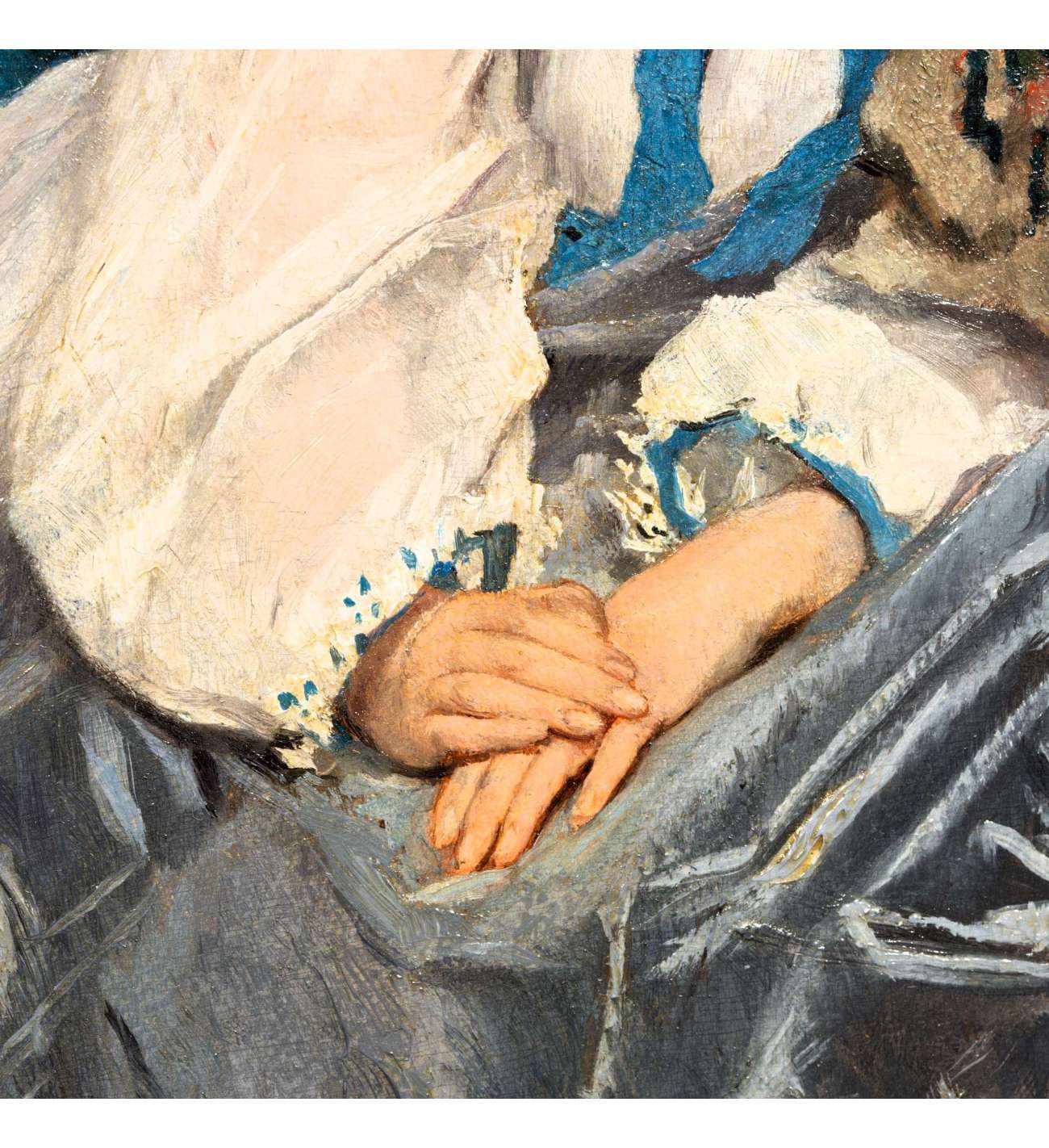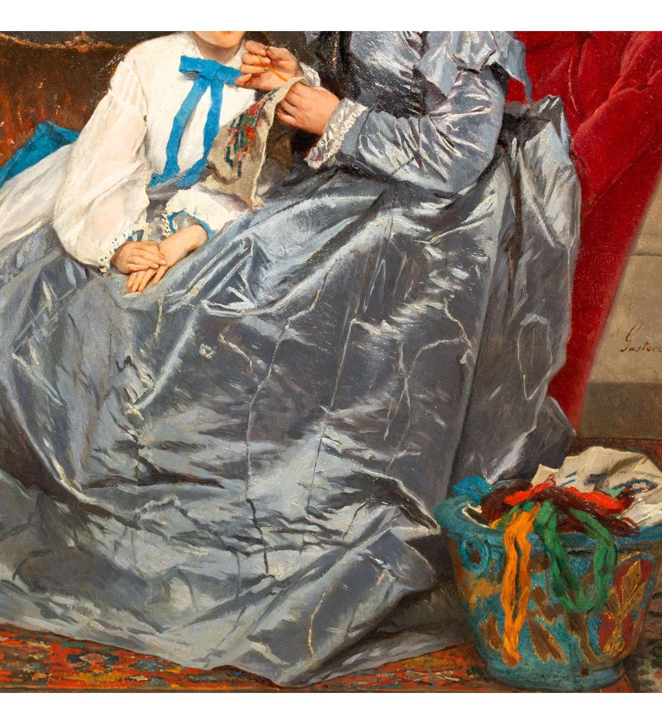 "La leçon de broderie est une représentation magistrale de la capacité de Gustave De Jonghe à capturer l'élégance et l'intimité de la vie domestique. Grâce à son utilisation sophistiquée de la couleur, à son coup de pinceau méticuleux et à son souci du détail, De Jonghe crée une scène simultanément réaliste et émotionnelle, célébrant la chaleur des liens familiaux et la transmission de la tradition à travers les générations.