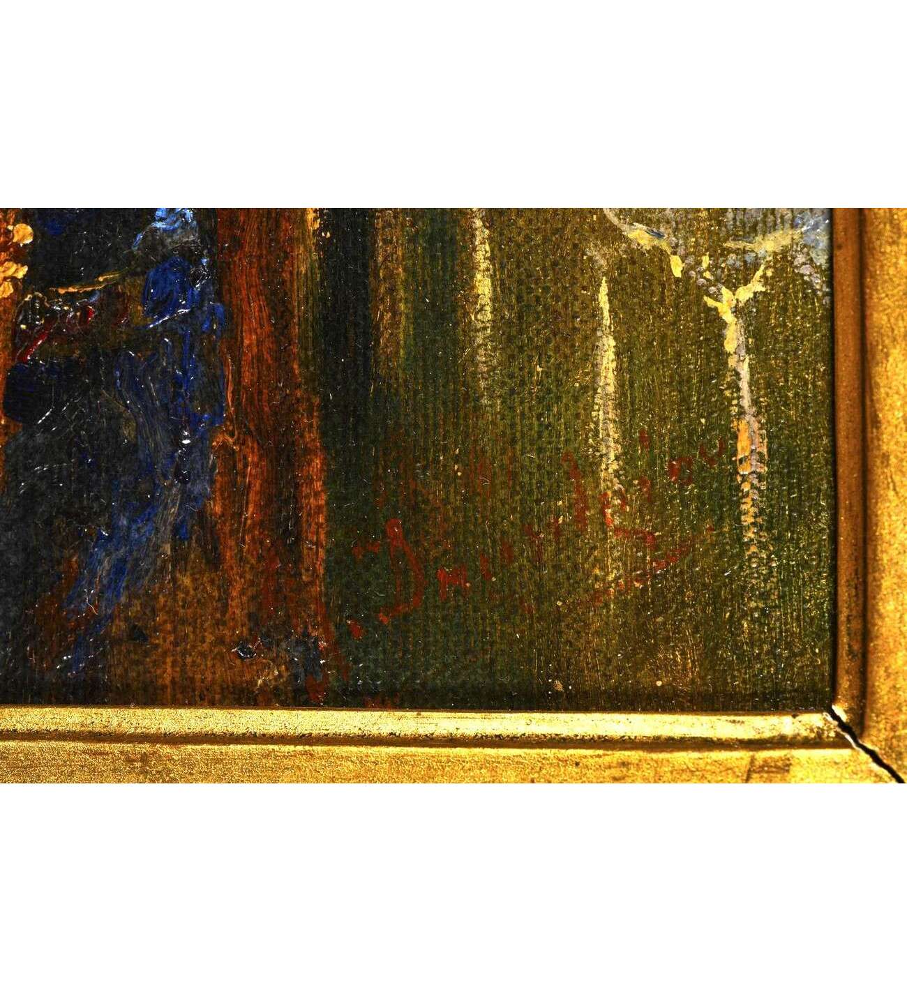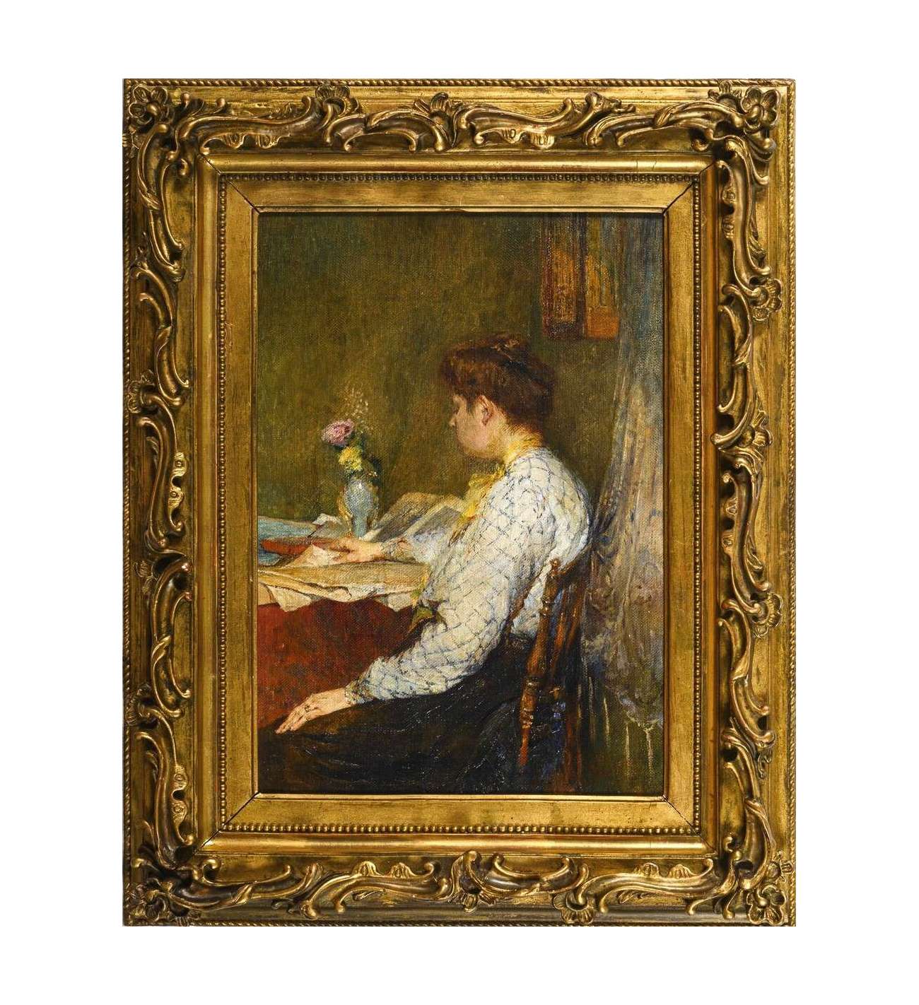 Le cadre du tableau prolonge cette impression d’élégance intemporelle. Il s’agit d’un encadrement richement orné dans le style rocaille, probablement réalisé entre 1880 et 1900, avec volutes dorées, feuilles d’acanthe et perles. Spectaculaire sans excès, ce cadre s’accorde parfaitement à l’ambiance bourgeoise du tableau et met en valeur ses tonalités chaudes et son intimité feutrée. Sans dominer l’image, il l’amplifie avec discrétion — comme le voulait l’esthétique de la Belle Époque. Une alliance rare et précieuse entre peinture et encadrement, formant un ensemble décoratif de grande qualité.