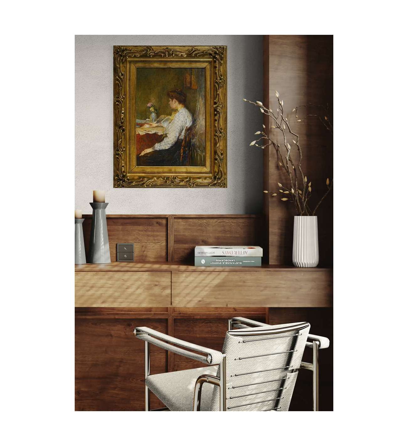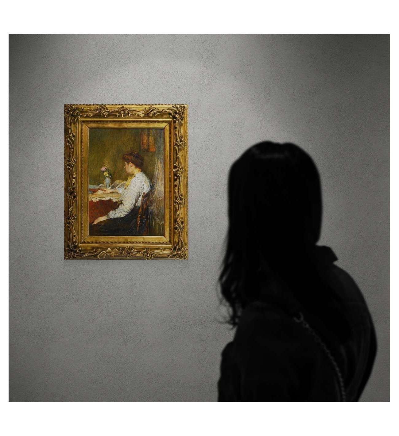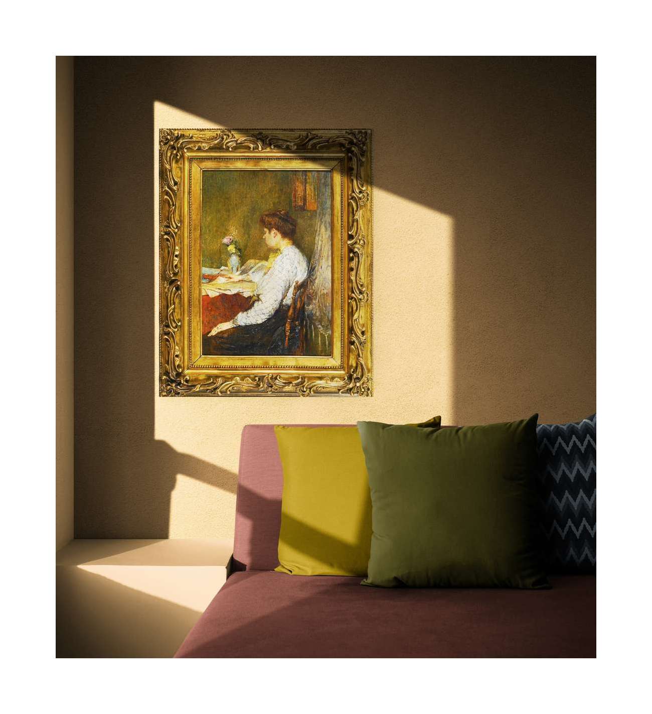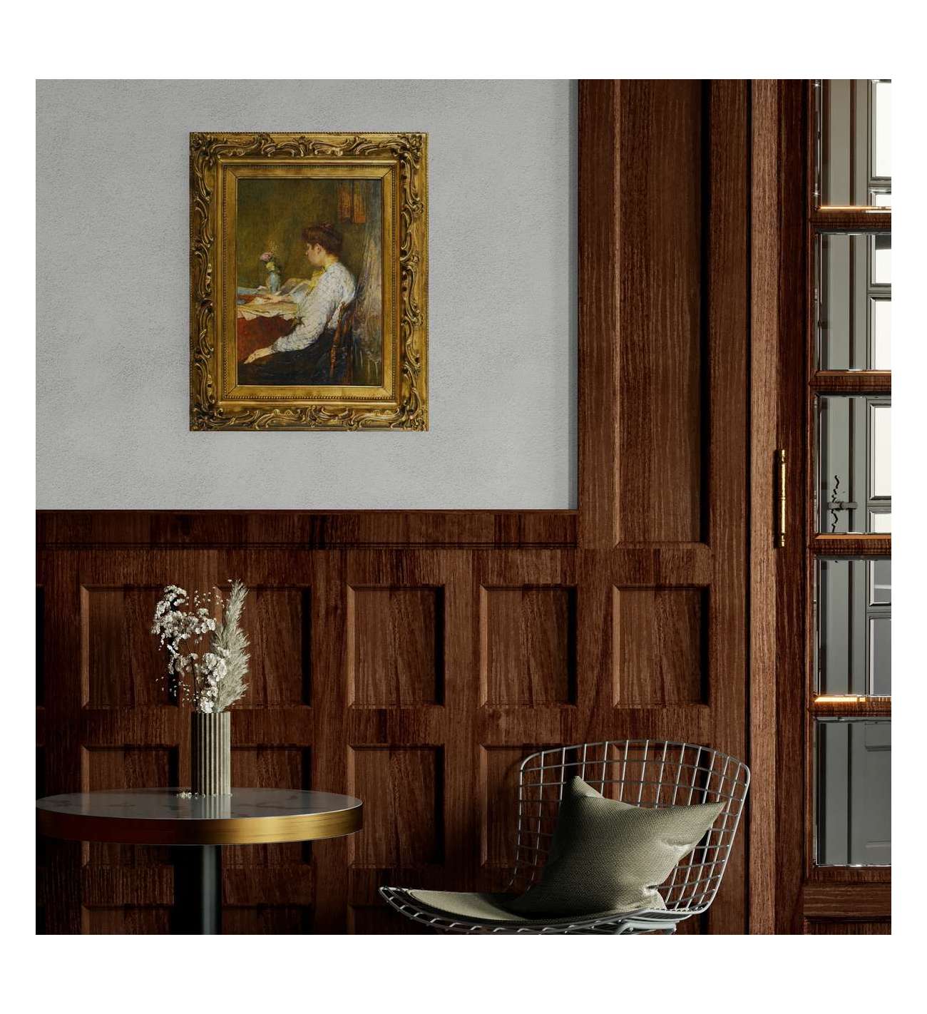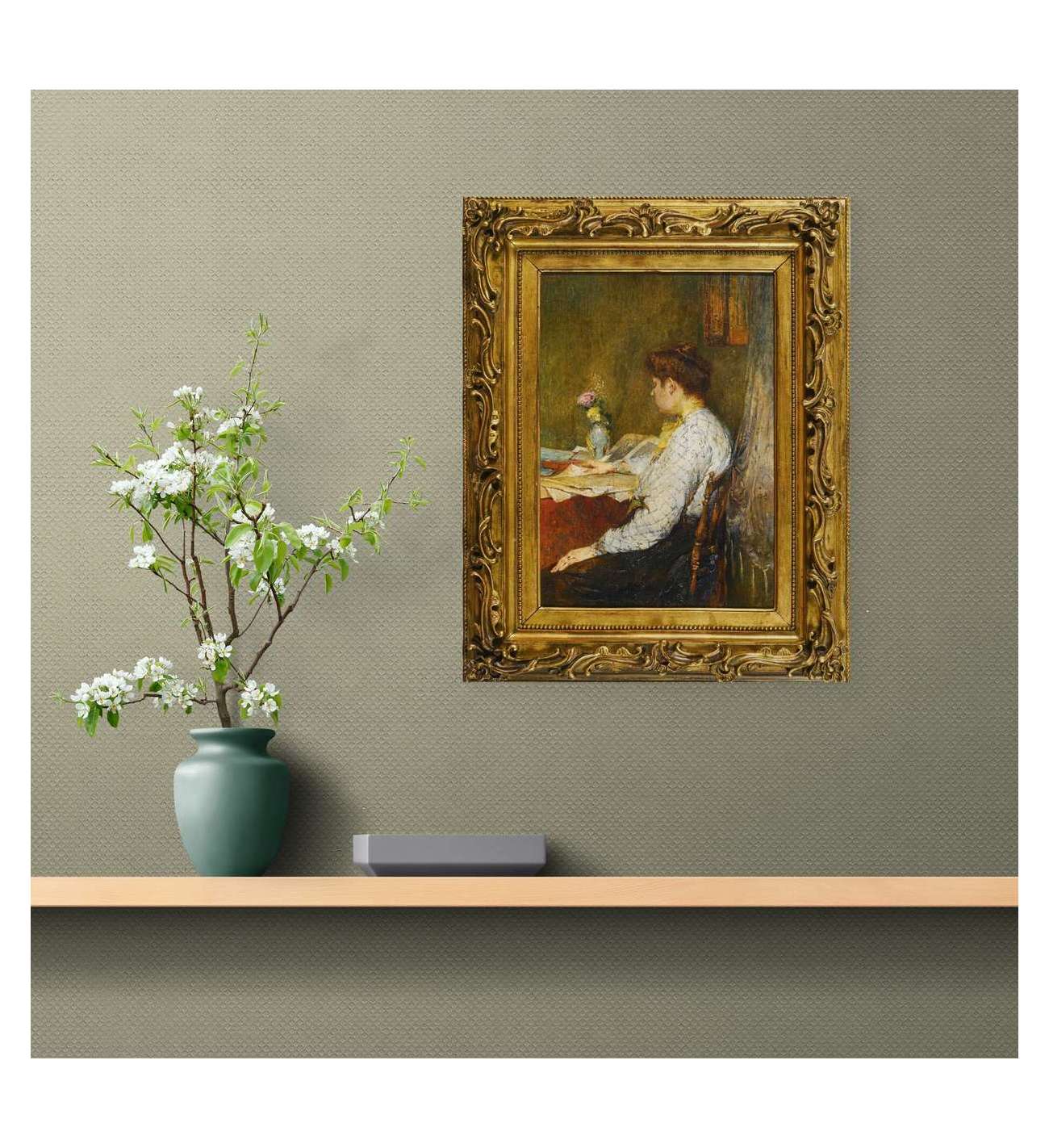 Ce tableau, d’une exquise délicatesse, capte un instant suspendu, baigné dans la lumière discrète d’un intérieur feutré. La femme, absorbée dans sa lecture, semble appartenir à un monde intérieur que l’artiste ne fait qu’effleurer du regard — avec la pudeur d’un confident, et la tendresse d’un observateur.