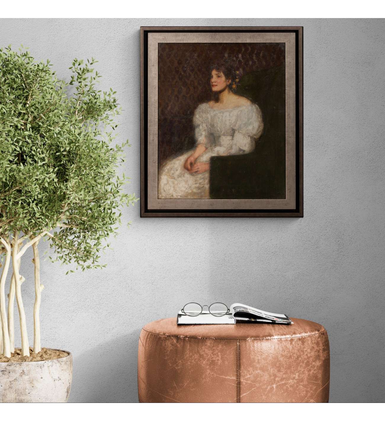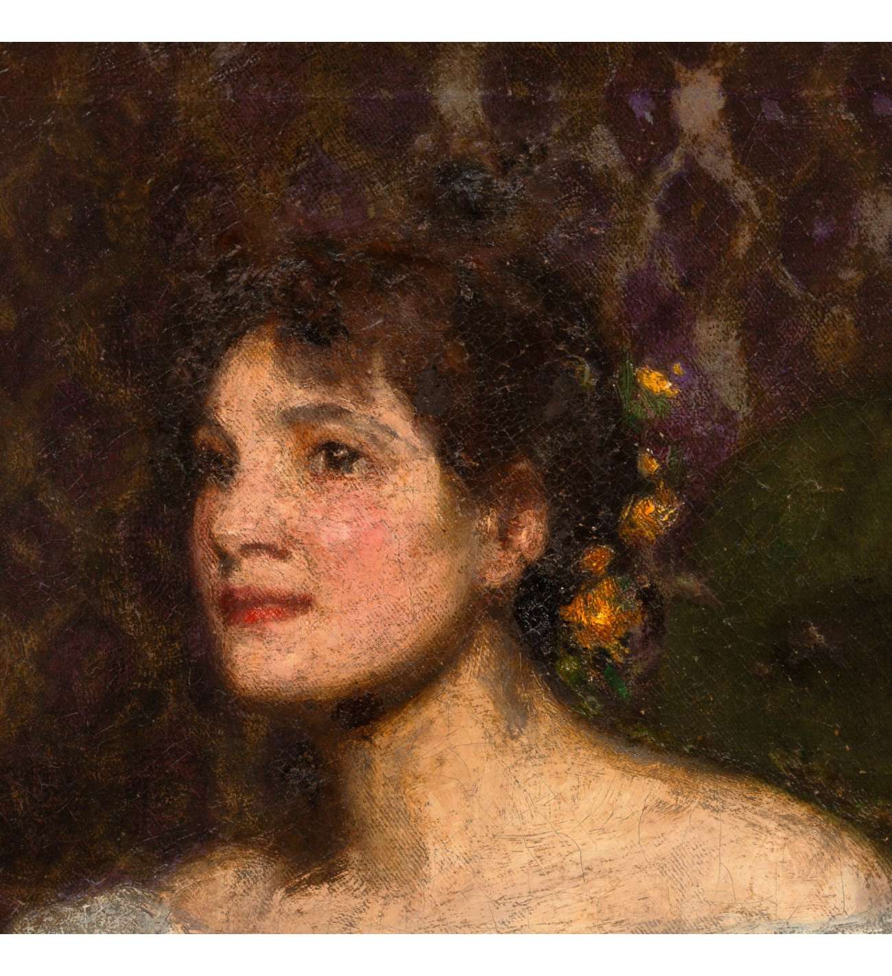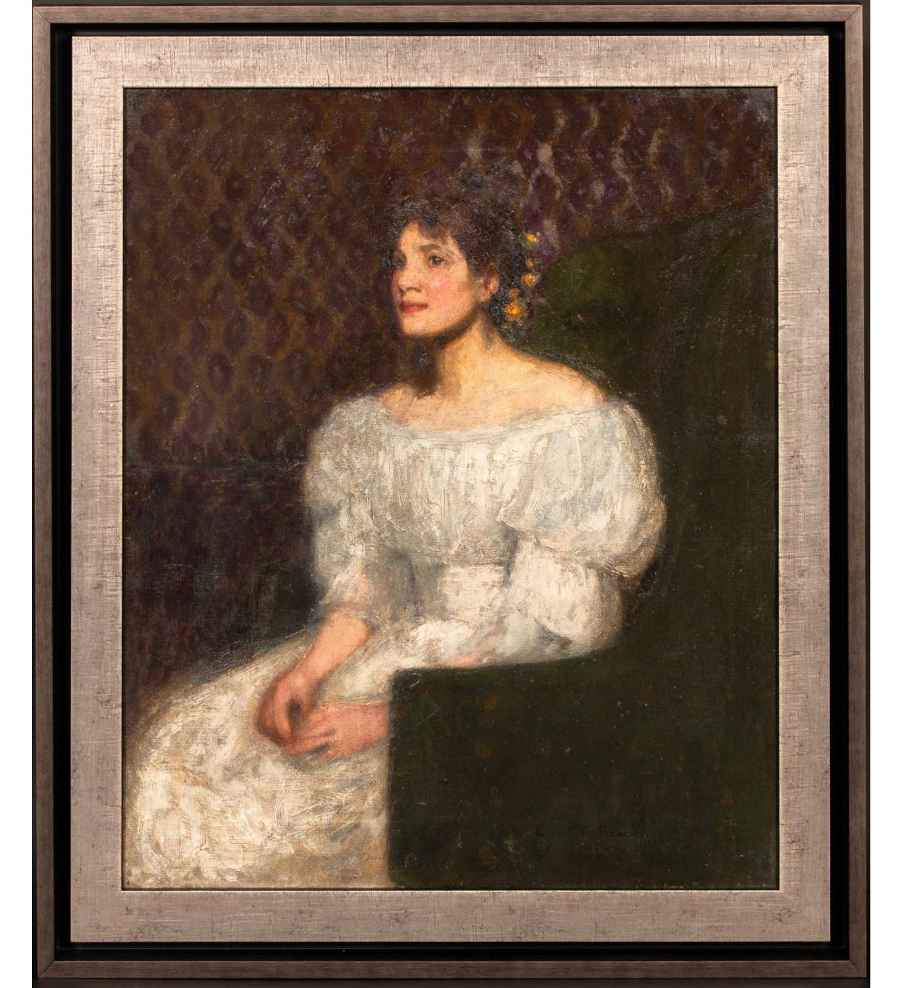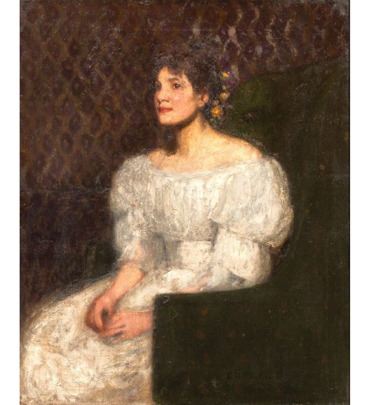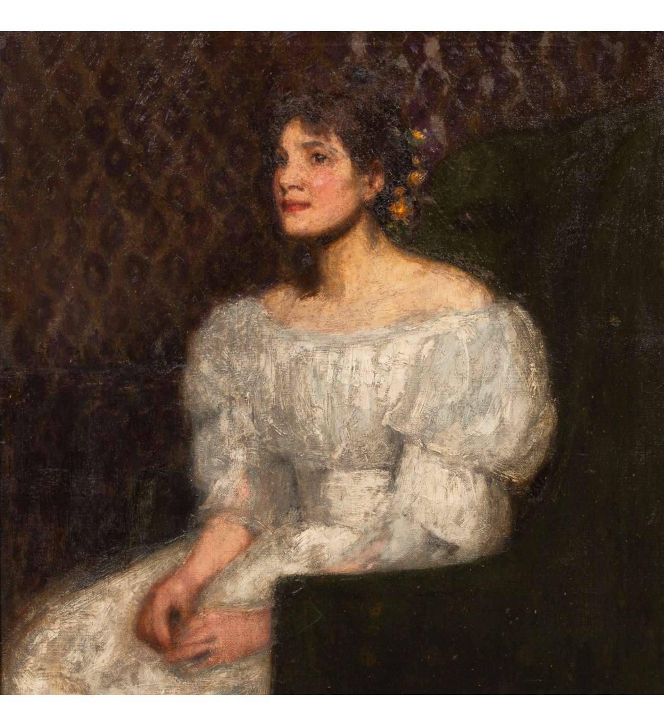 Ce portrait revêt une dimension intime particulière : le modèle serait Mary Ann Brown, que l’artiste épousera quelques années plus tard. La maîtrise technique de Beach transparaît dans le rendu soigné des textures et la psychologie du regard.