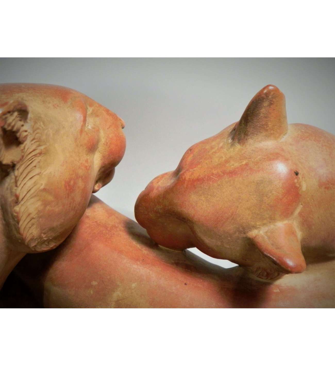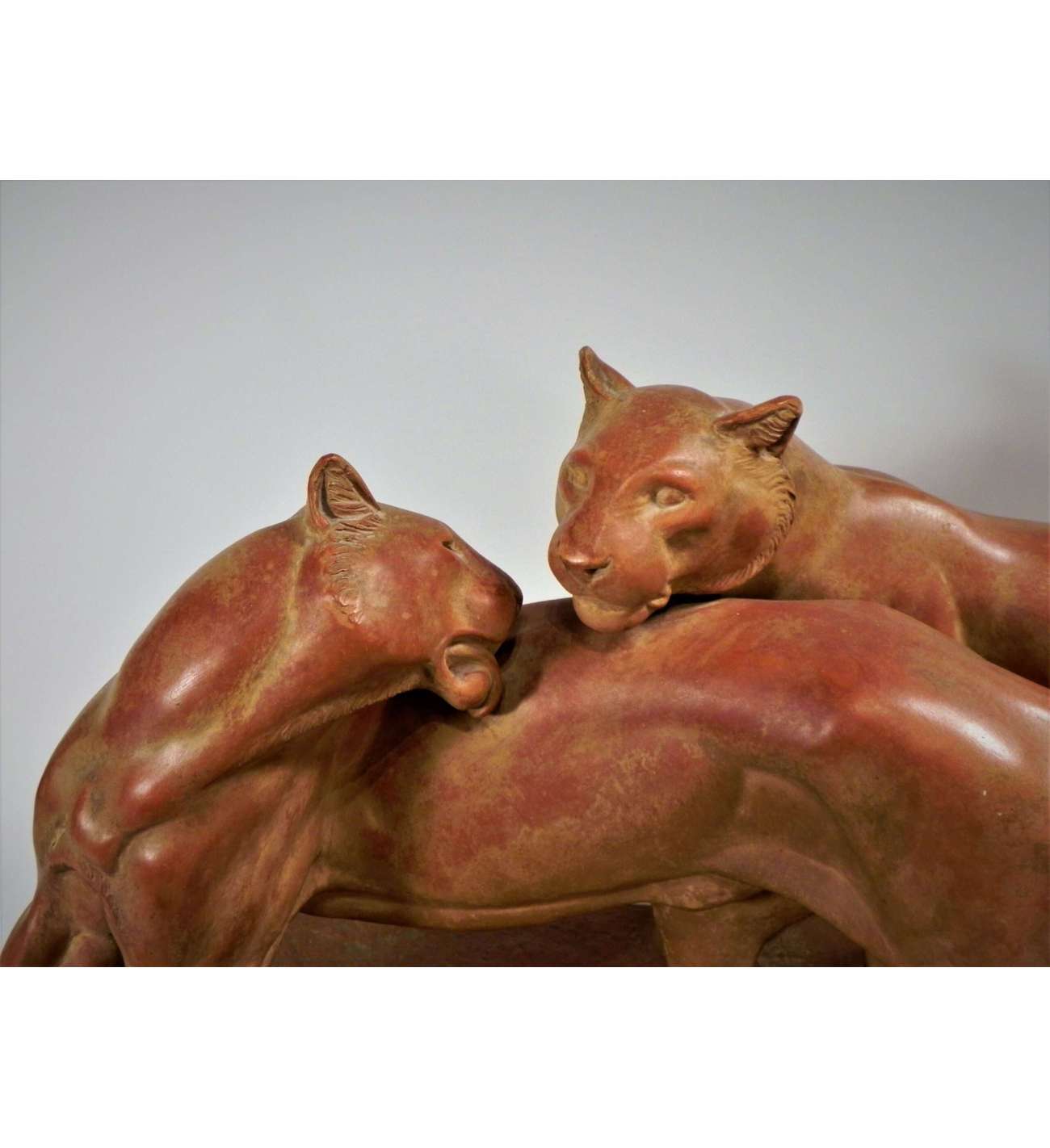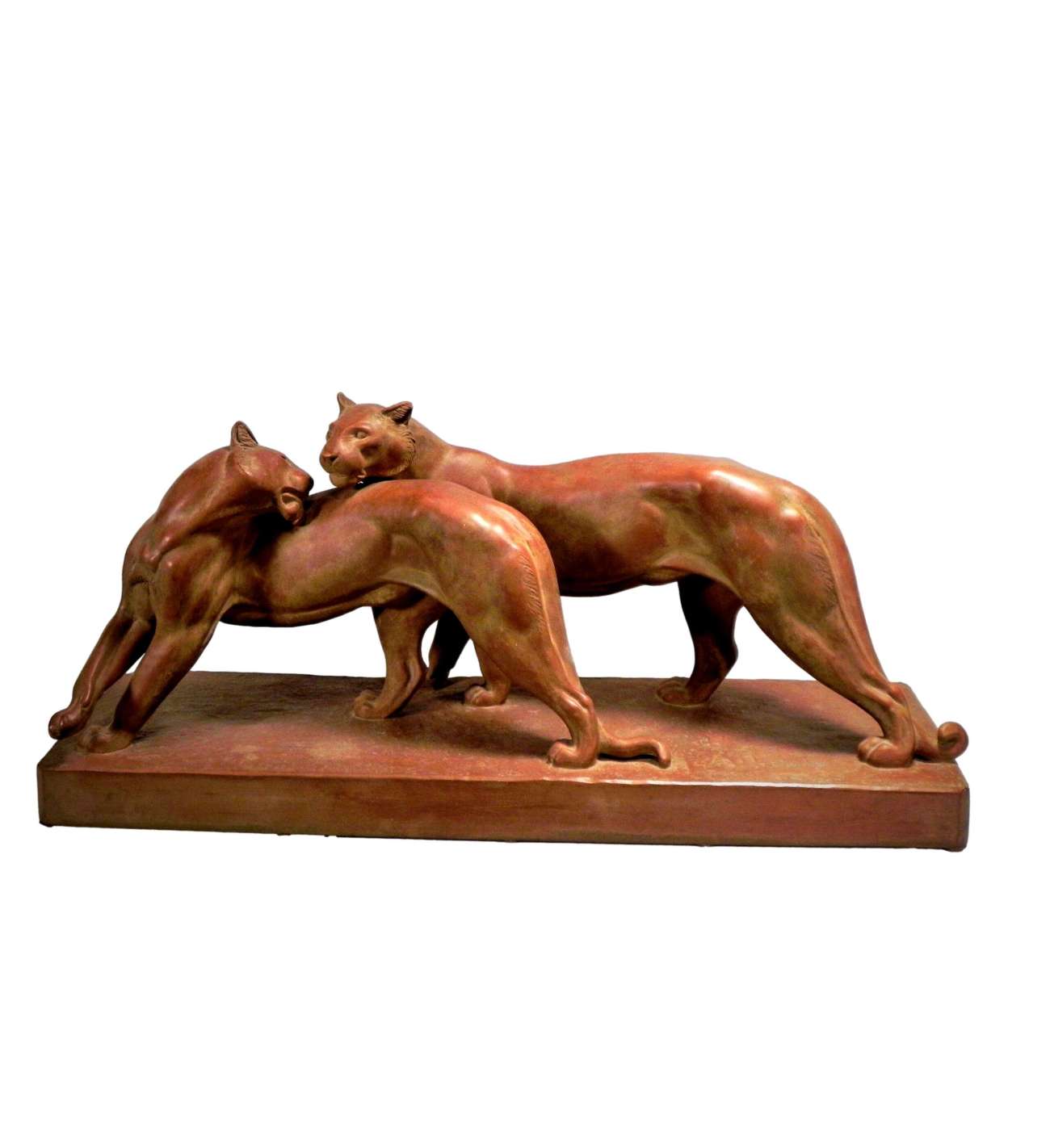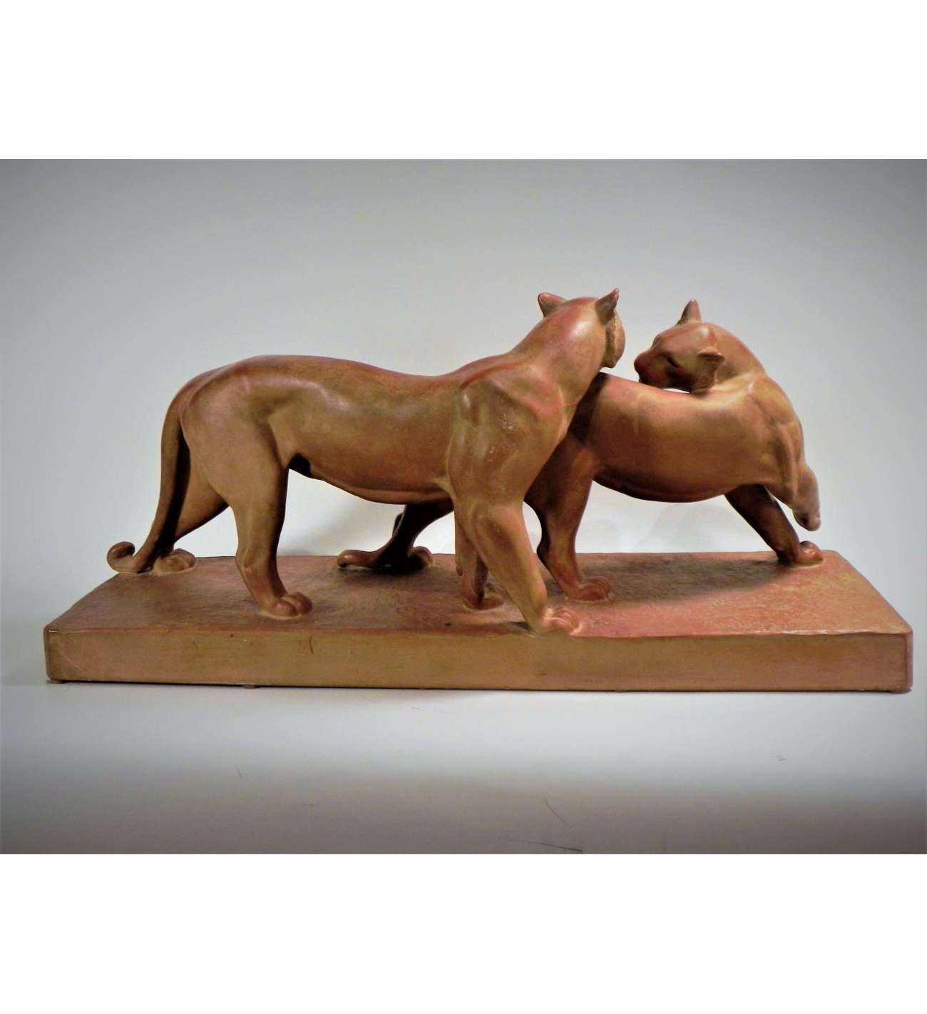 Cette œuvre magistrale en terre cuite est une création emblématique d'Irénée Rochard (1906-1984), l'un des sculpteurs animaliers les plus illustres du XXe siècle. Intitulée "Panthères", cette pièce d'envergure (76 cm de longueur) témoigne de la fascination de l'artiste pour la grâce féline et la puissance tranquille des grands prédateurs. La composition met en scène un couple de panthères dans une attitude d'une rare élégance, mêlant la tension musculaire à une complicité presque tendre.