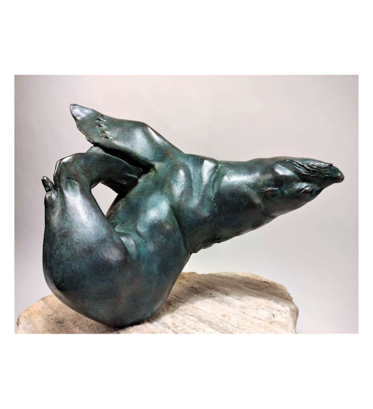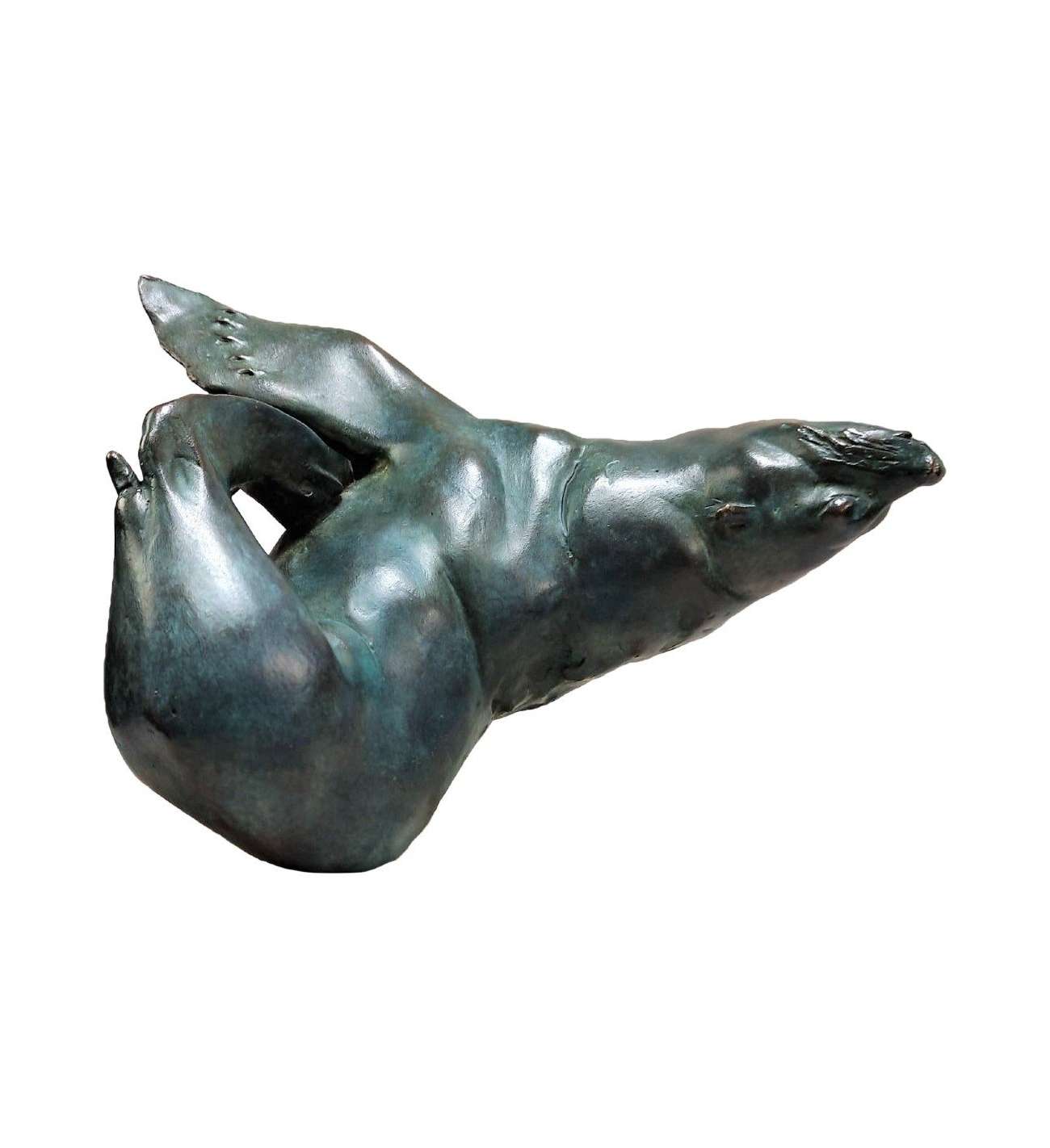 Cette sculpture en bronze intitulée « Lion de Mer » est une œuvre significative de l'artiste belge Greta van Puyenbroeck, née en 1943. Représentant l'animal dans une posture dynamique de torsion, cette pièce témoigne d'une recherche approfondie sur la fluidité des formes aquatiques et la densité des volumes. L'œuvre s'inscrit dans la tradition de la sculpture animalière du XXe siècle, où l'épuration du trait sert l'expression de la force vitale.