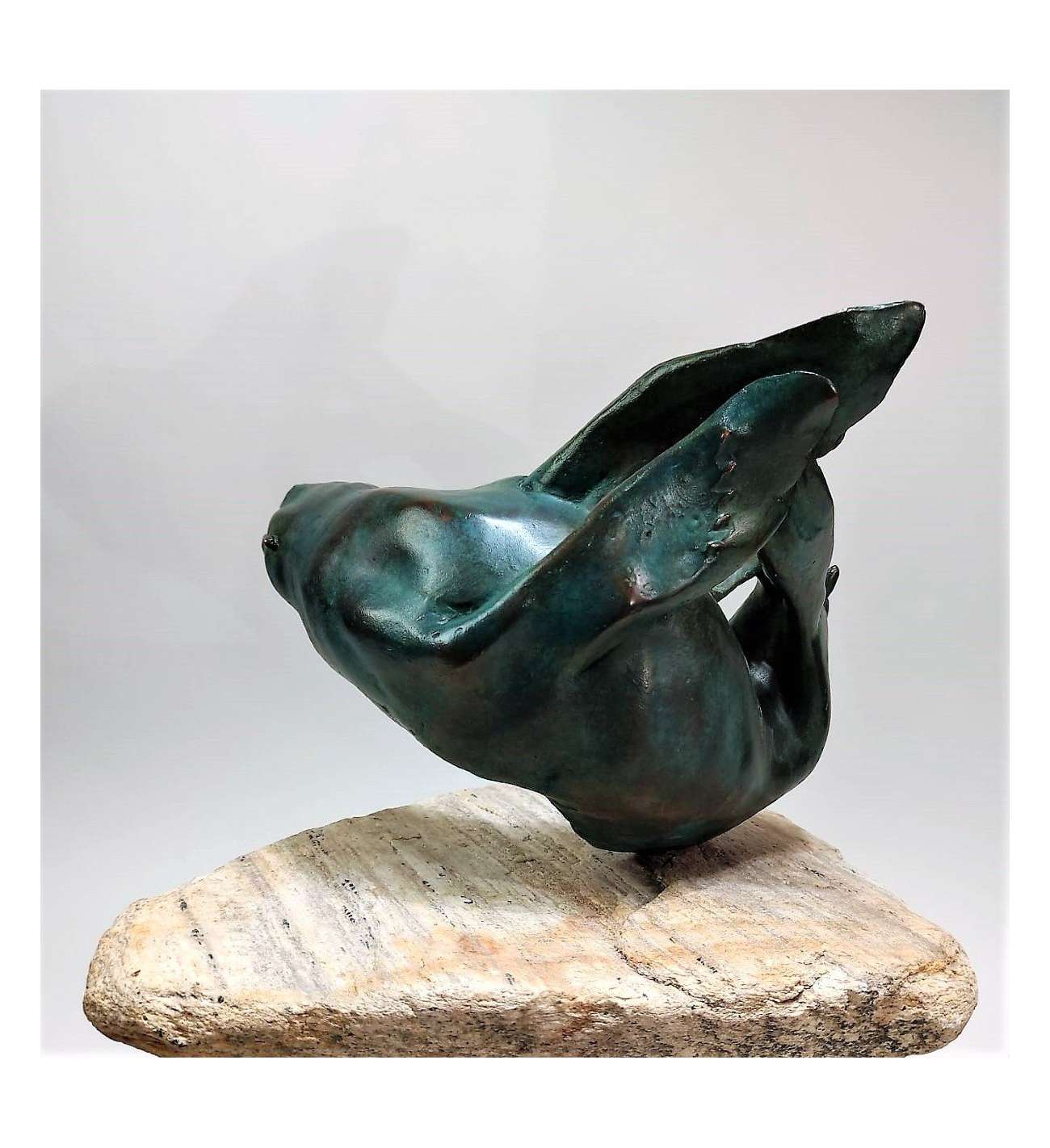 Présentée sur un socle en pierre naturelle qui accentue son caractère organique, l'œuvre comporte la signature incisée de l'artiste. Cette pièce constitue une opportunité rare pour un collectionneur d'acquérir une œuvre de Van Puyenbroeck alliant la rigueur du travail du métal à une sensibilité naturaliste moderne. Les dimensions harmonieuses permettent une intégration aisée dans un intérieur de collection.