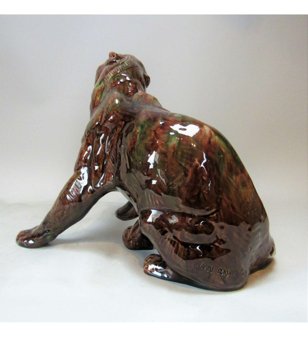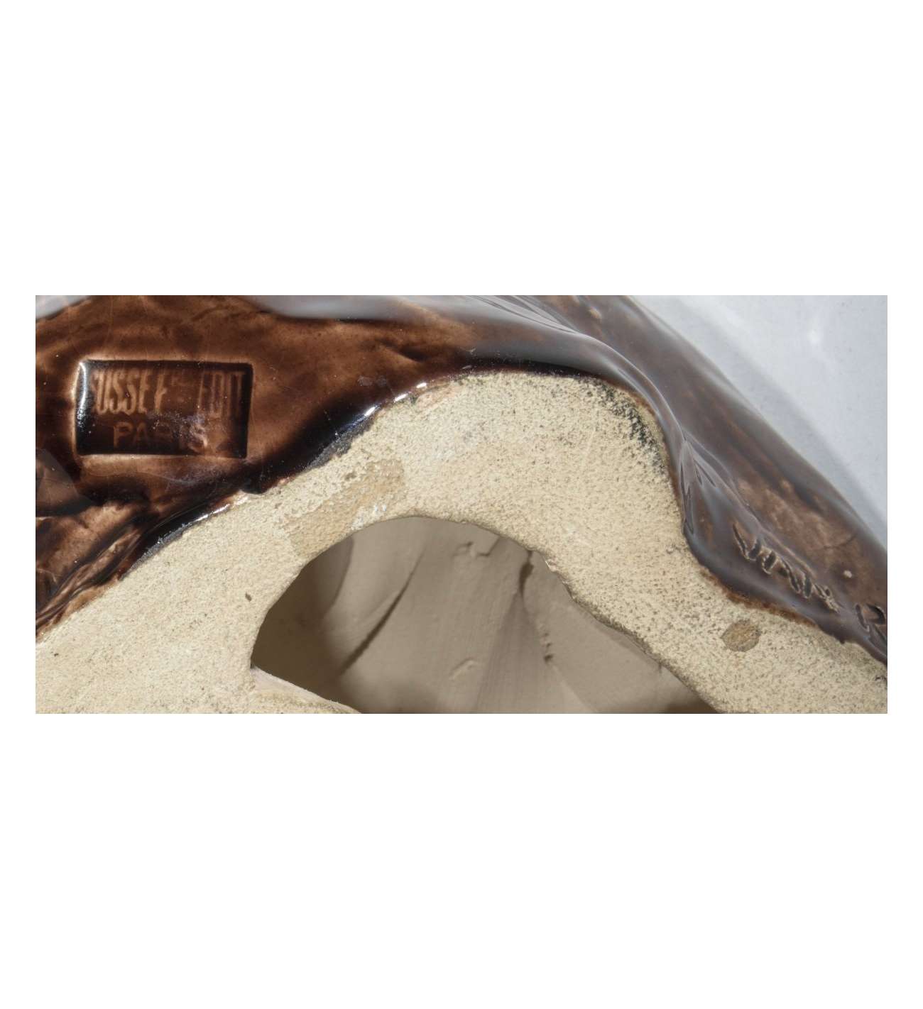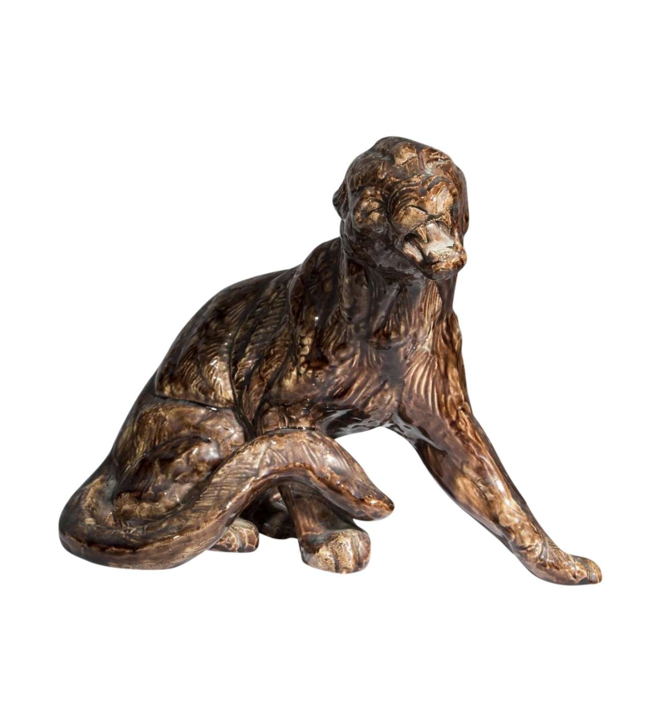 L'œuvre est exécutée en céramique émaillée avec une glaçure aux nuances de brun profond et de reflets mordorés, rappelant les patines de bronze. Cette édition de haute qualité a été produite par la prestigieuse maison Susse Frères Paris, dont le cachet d'éditeur est apposé sous la base. L'état de conservation est excellent, préservant la finesse des détails anatomiques, notamment le modelé de la gueule rugissante.