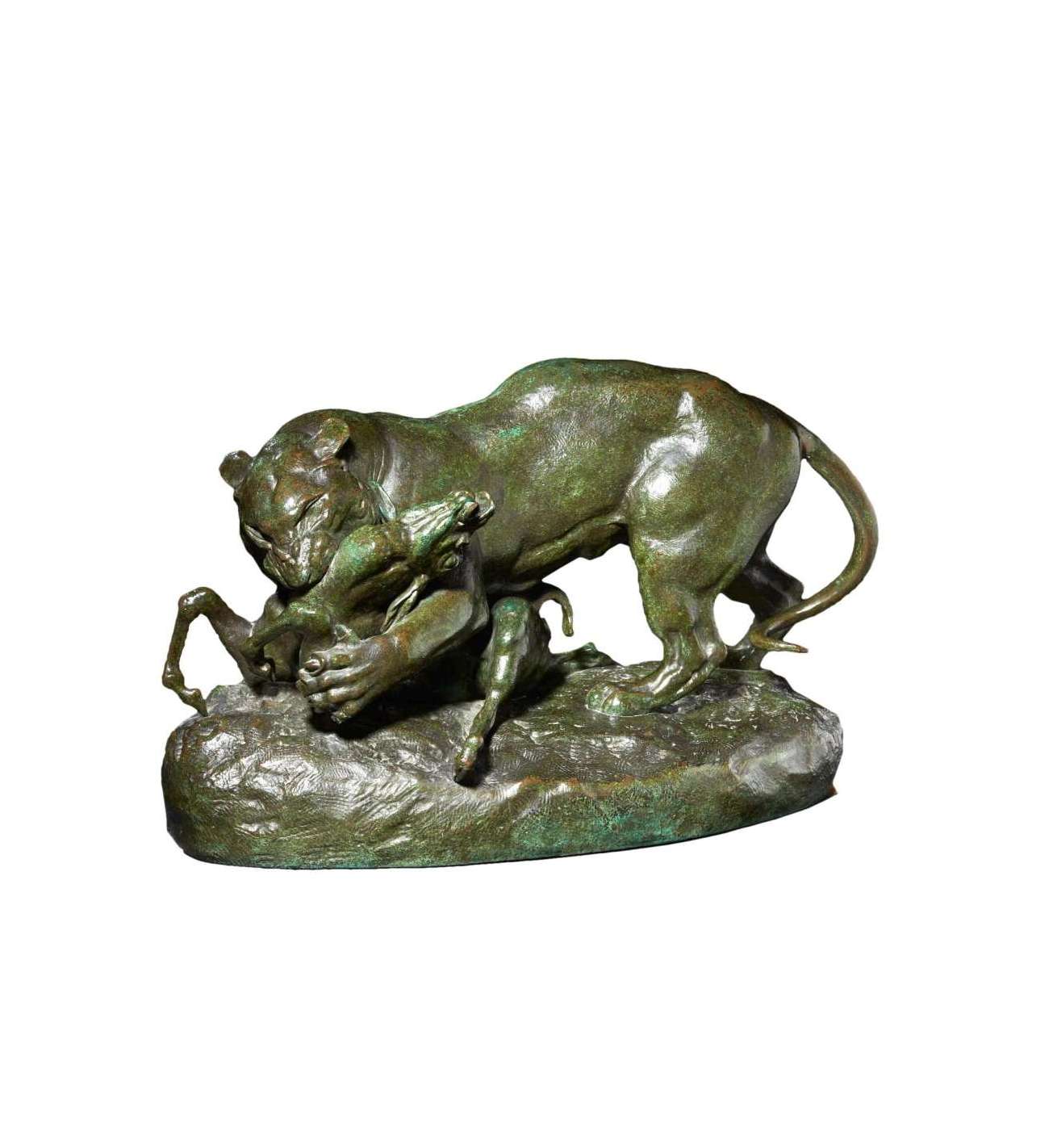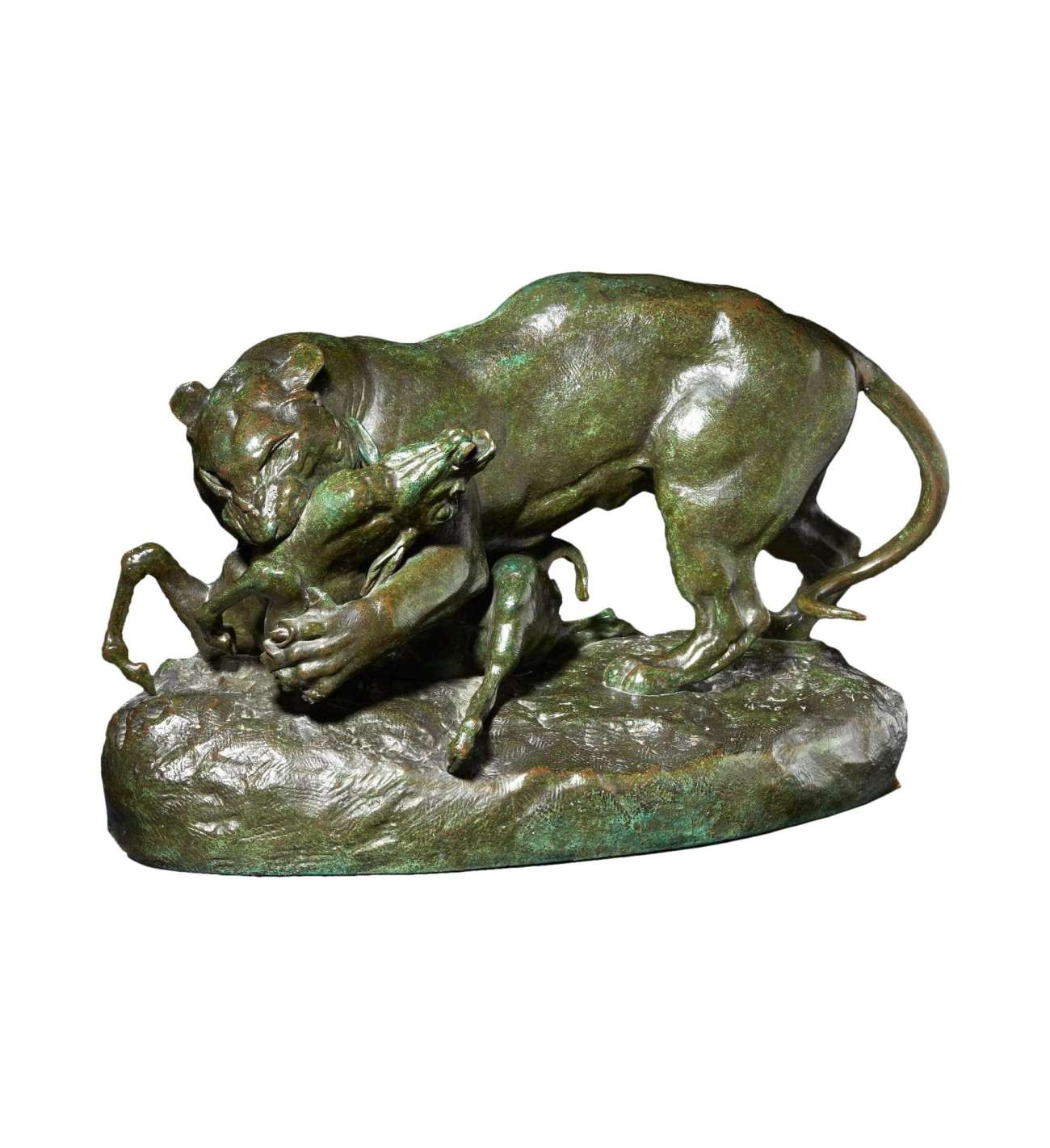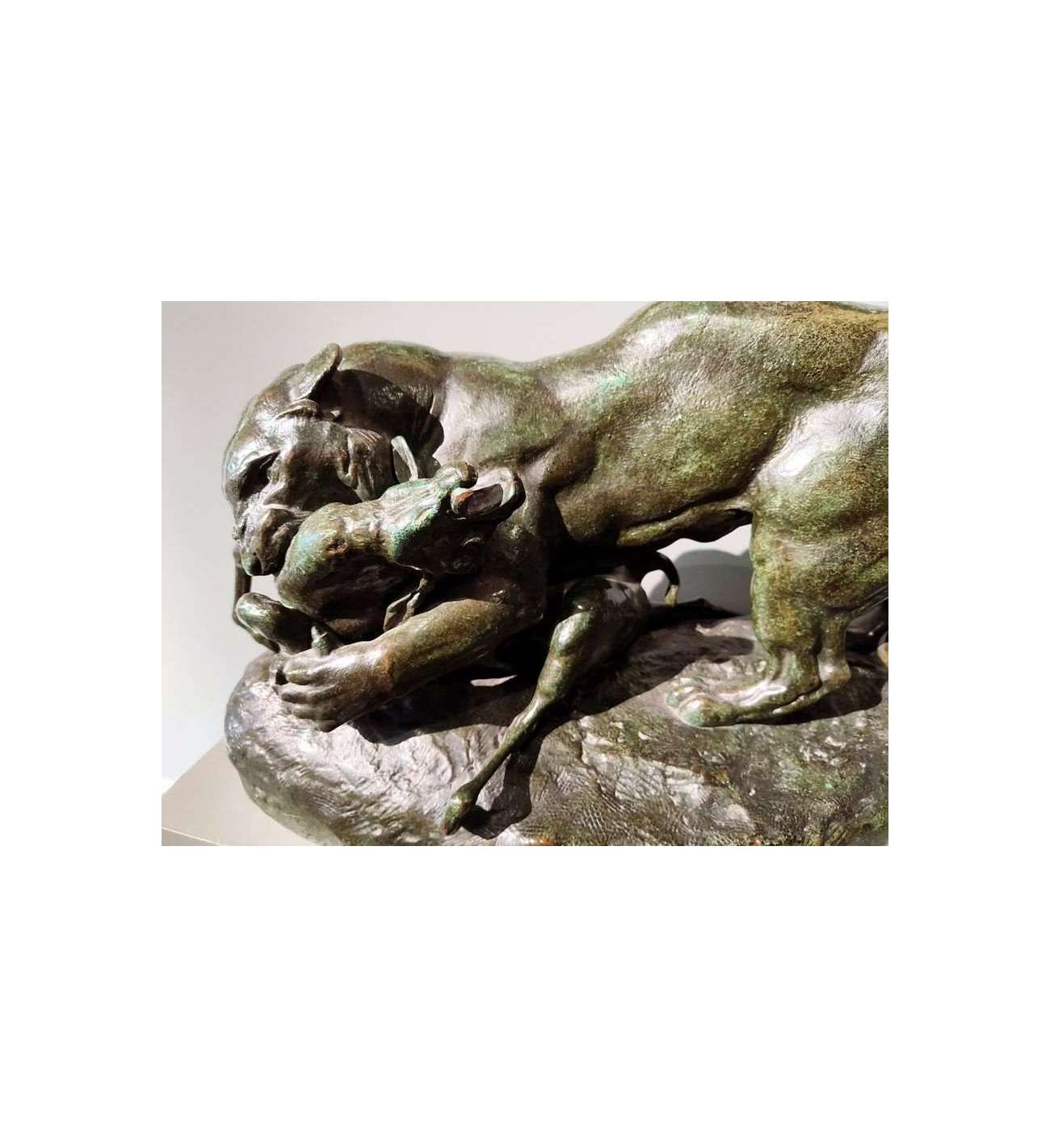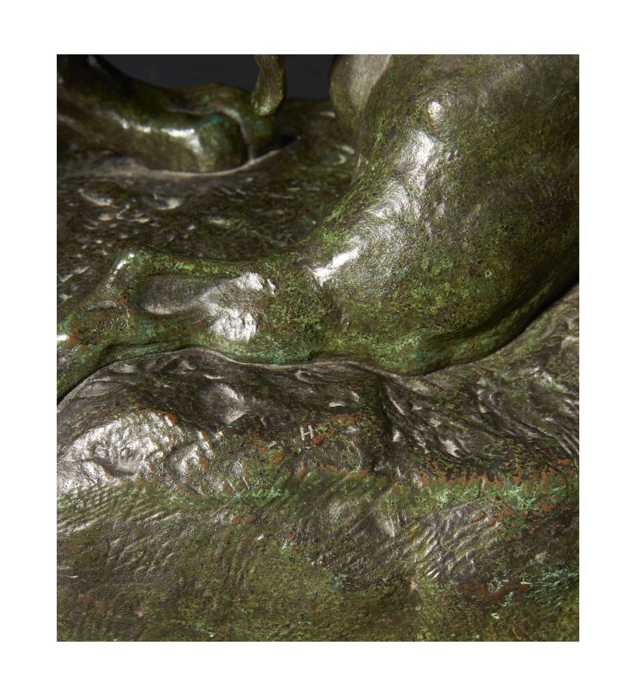 Gegoten rond 1880, is dit exemplaar voorzien van de signatuur "BARYE" en het "H"-stempel van bronsgieter Hector Brame, wat staat voor een superieure gietkwaliteit. De genuanceerde groene patina is diep en rijk, waardoor de anatomische precisie en de texturen van de huid prachtig tot hun recht komen. Met een lengte van 58 cm is dit een imposant object met een museale uitstraling.