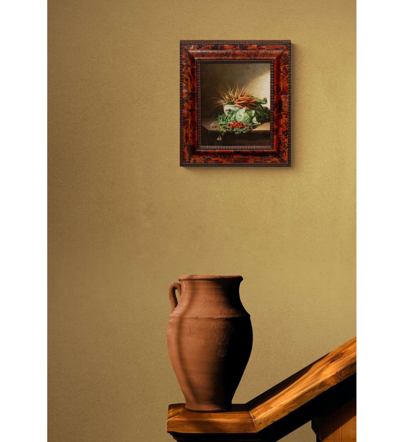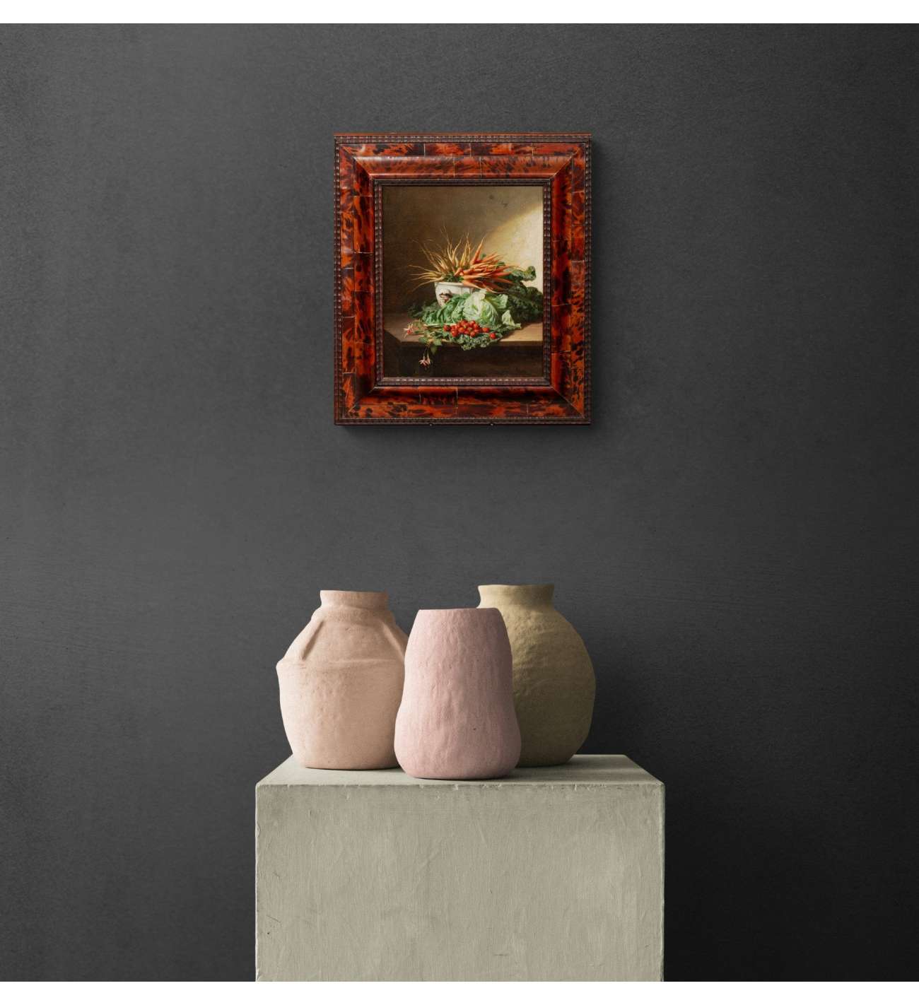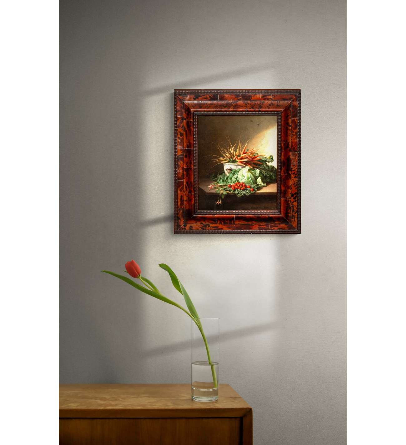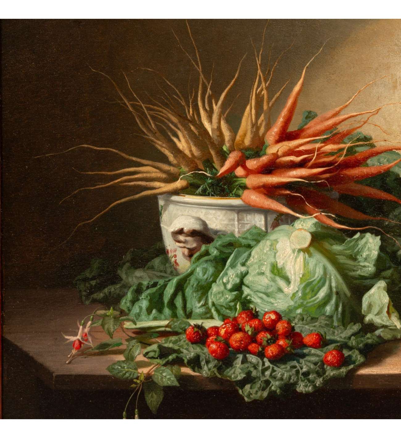 Dit uitzonderlijke stilleven van David Émile Joseph de Noter (1825-1892) viert de ruwe schoonheid van verse groenten met een typisch Vlaamse virtuositeit. In een versierde aardewerken bloempot springt een spectaculair boeket wortelen – sommige feloranje, andere met nog bleke wortels – als een plantaardig vuurwerk naar voren. Op de voorgrond staat een royale kool naast levendig rode bosaardbeien en takken met cherrytomaten die nog aan hun stengel hangen.