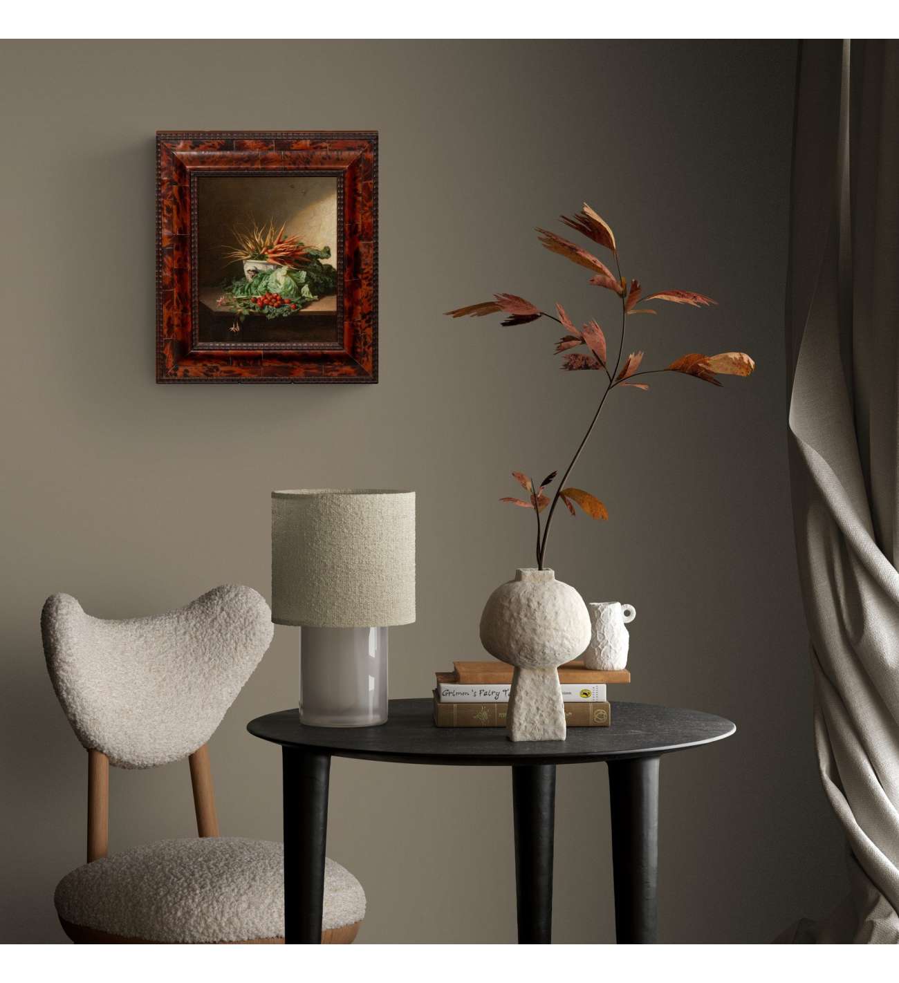 De Noter, erfgenaam van de grote traditie van de Vlaamse stillevens uit de 17e eeuw, laat hier al zijn talent zien: het dramatische clair-obscur dompelt de compositie onder in een intieme sfeer, terwijl het gouden licht elke groente met een bijna fotografische precisie streelt. Elk detail telt: de delicate worteltjes van de wortelen, de nerven van de kool, de vochtige glans van de aardbeien, het opschrift op de aardewerken pot.
