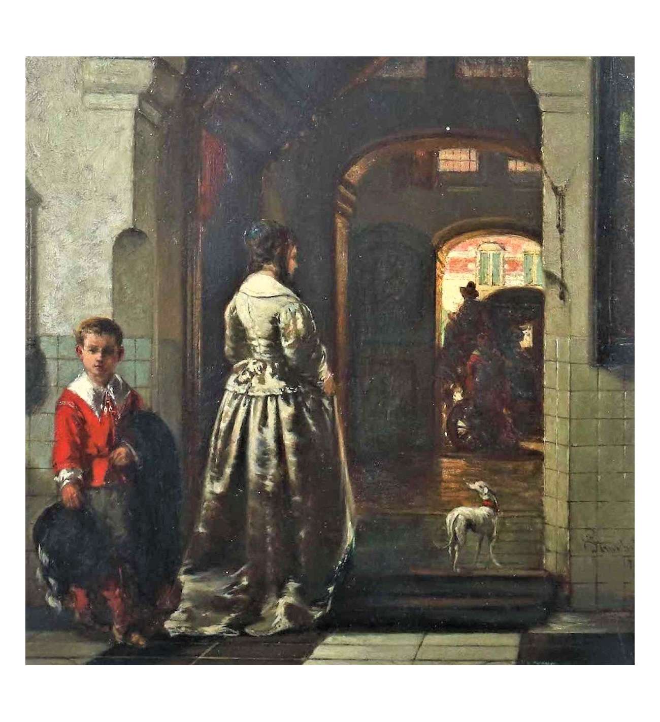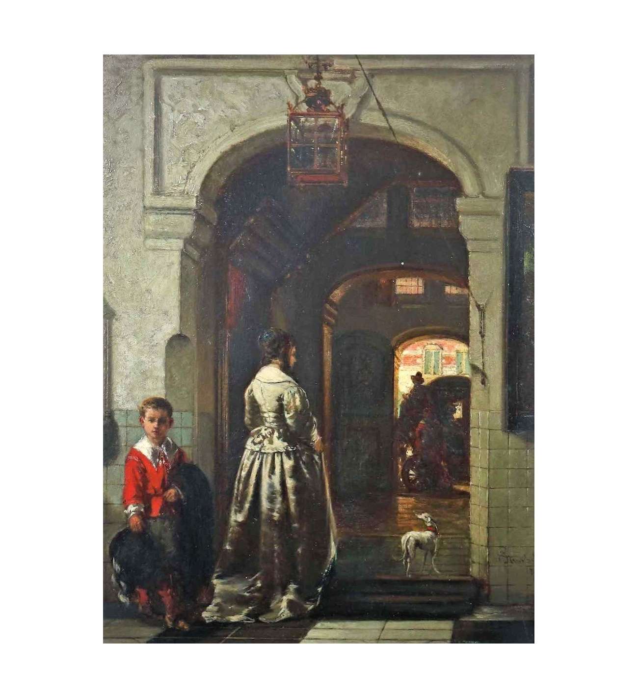 In dit werk van Johannes Stroebel, getiteld Het Afscheid, herkennen we de essentie van de 19e-eeuwse Nederlandse genreschilderkunst. De kunstenaar, een groot bewonderaar van de 17e-eeuwse meesters, hanteert hier een strakke compositie die speelt met diepte en lichtinval. De blik wordt direct getrokken naar het contrast tussen het halfduister van de vestibule en het heldere licht buiten, waar een koets klaarstaat voor vertrek.