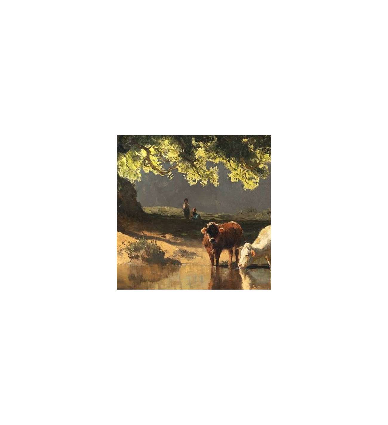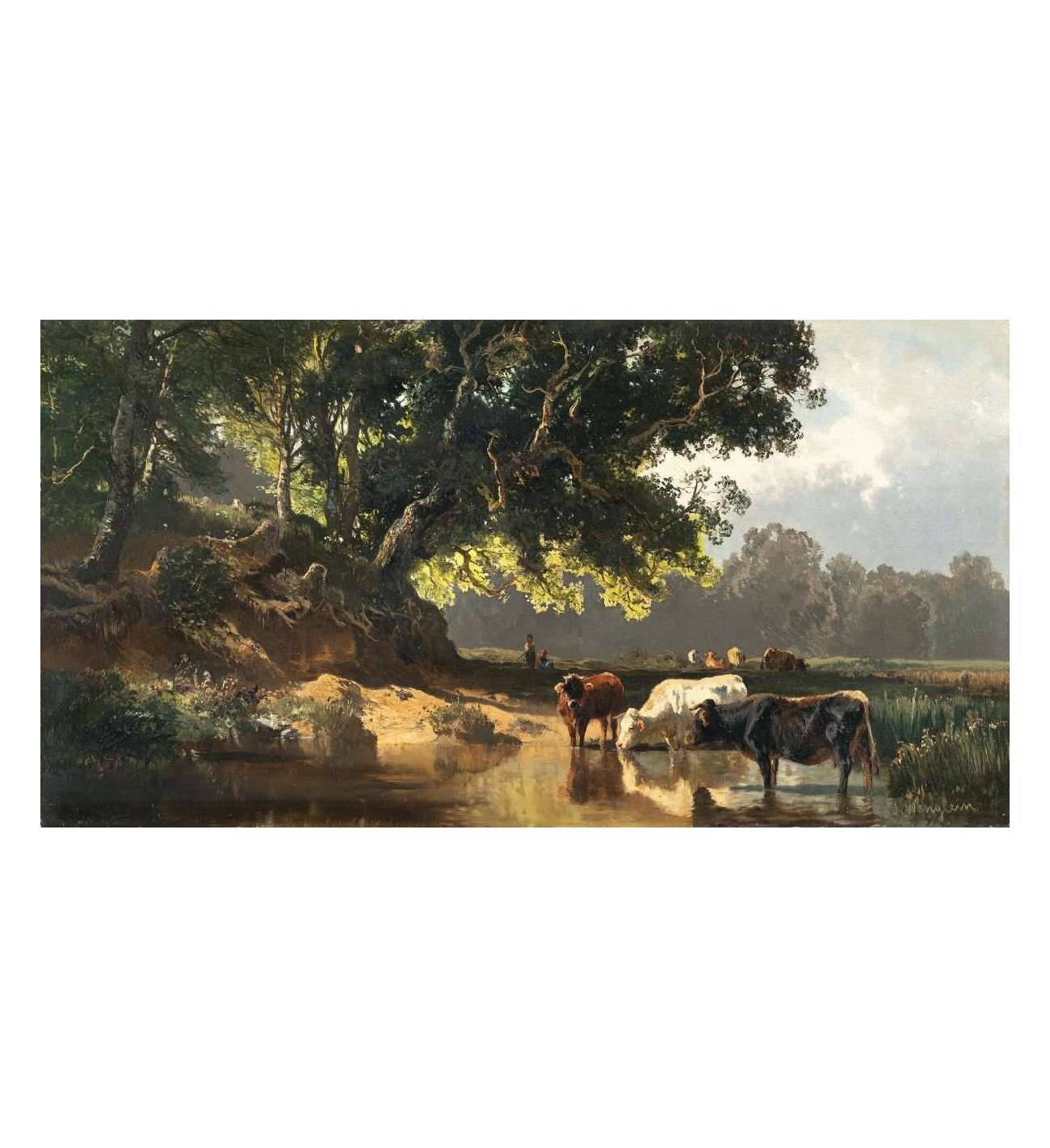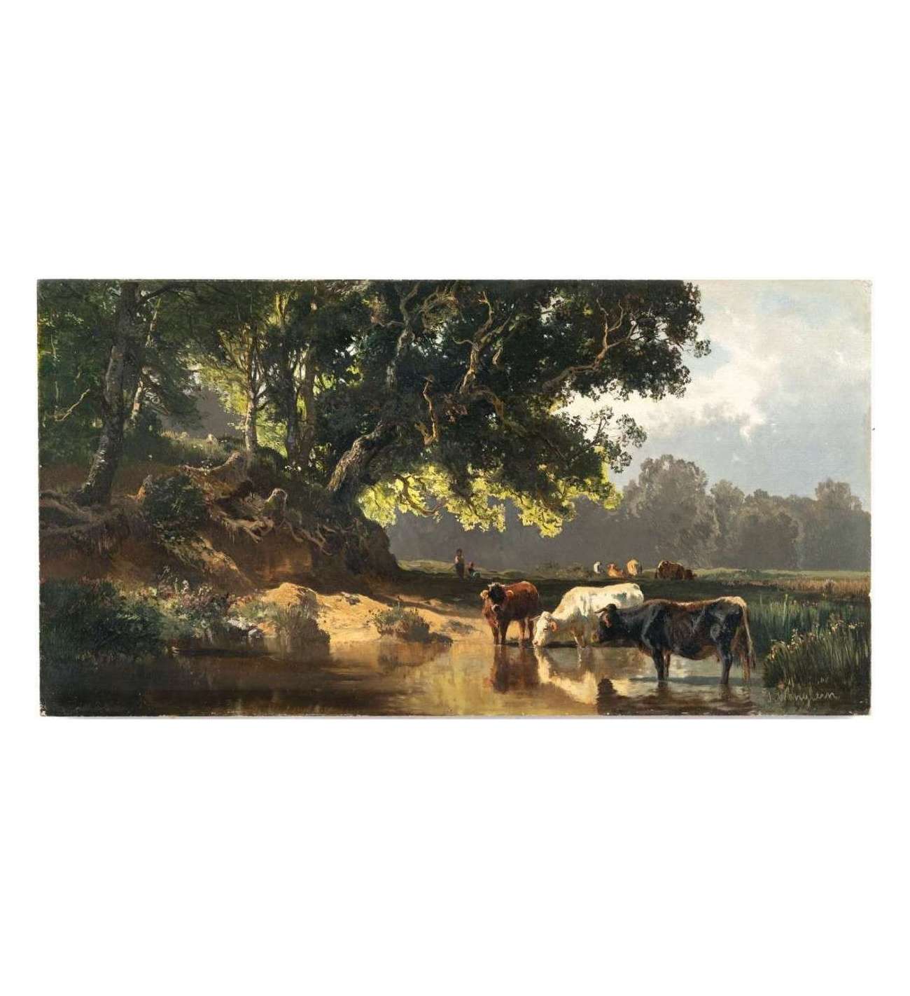 Dit prachtige schilderij stelt een landelijke scène voor op een mooie zomerdag. De invloed van de school van Barbizon is duidelijk zichtbaar. Deze afbeelding van uit een rivier drinkende koeien is een sterk voorbeeld van de coloristische methode die Joseph Wenglein leerde van zijn leermeester Adolf Heinrich Lier. De behandeling van kleur en het gebruik van licht en schaduw dragen allemaal bij aan de sfeer van een vroege zomerdag en illustreren Joseph Wengleins overtuiging dat landschappen natuurlijk moeten zijn, meer gericht op het algehele effect dan op de details, en wat we vandaag de dag "bedrieglijk eenvoudig" zouden noemen.